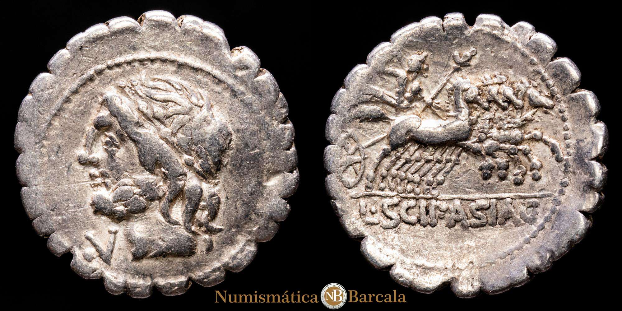 Cornelio. Denario. 106 aC Roma. (FFc-612). (Craw-311). (Cal-473). Anv.: Cabeza laureada de Júpiter a izquierda. Rev.: Júpiter en cuadriga a derecha, con cetro y rayo, en exergo L SCIP ASIAG. Ag. 3,77 gramos. MBC.