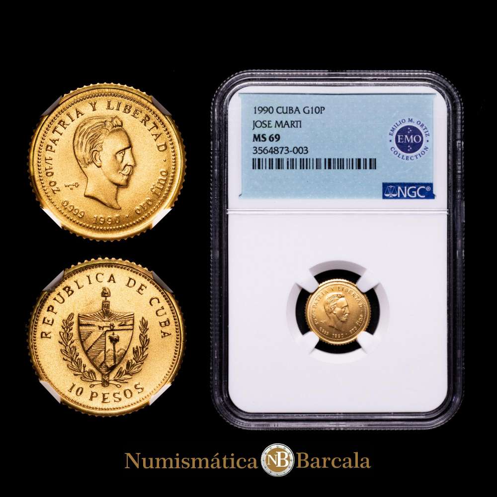 CUBA, Casa de la Moneda de La Habana, 10 pesos de oro, 1990, José Martí, NGC MS 69 (Etiqueta de la Colección EMO). KM-211; KM-24. Superficies con acabado esmerilado prácticamente impecables, de una tirada reportada de solo 15 piezas. Procedente de la Colección Emilio M. Ortiz de Monedas de Oro Cubanas.