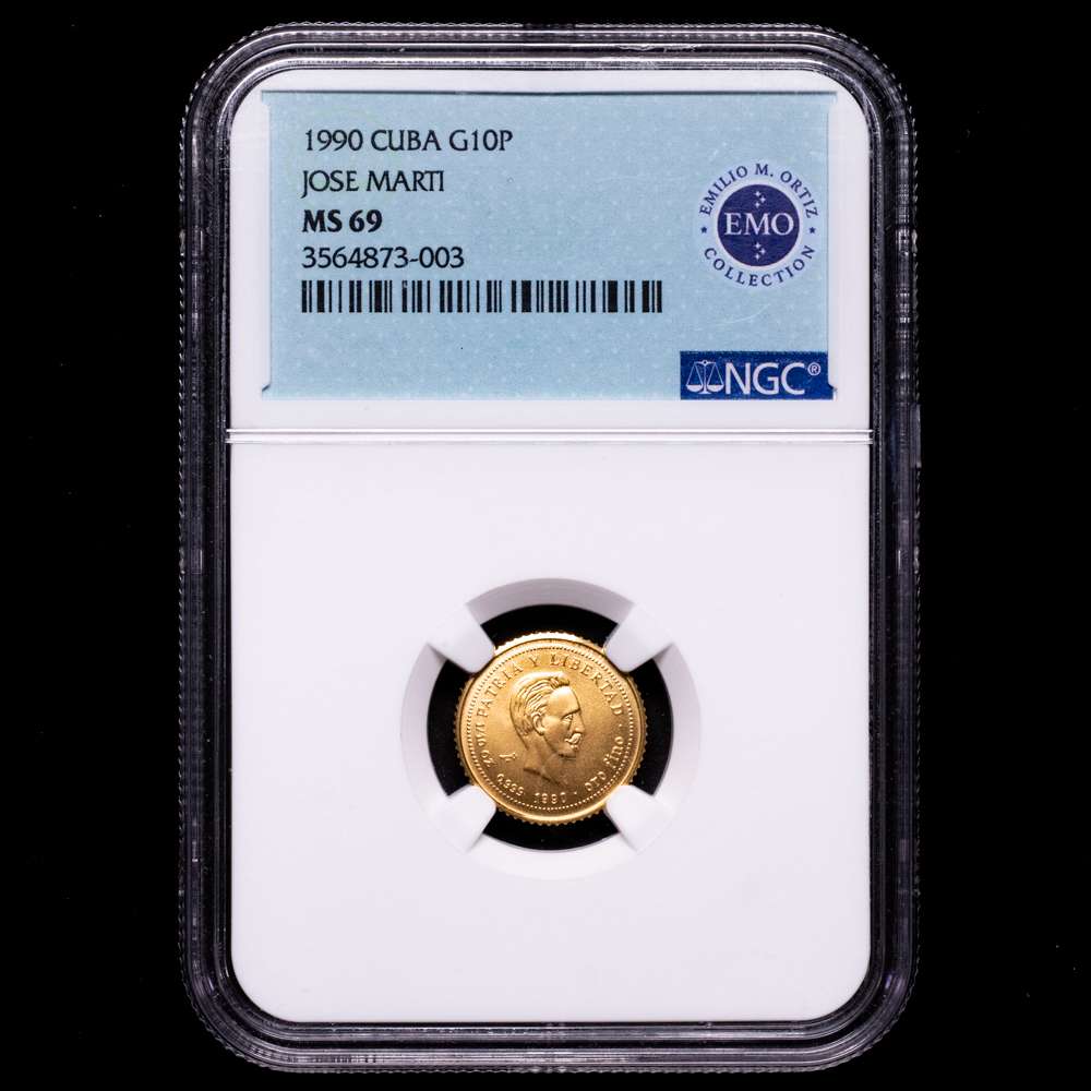 CUBA, Casa de la Moneda de La Habana, 10 pesos de oro, 1990, José Martí, NGC MS 69 (Etiqueta de la Colección EMO). KM-211; KM-24. Superficies con acabado esmerilado prácticamente impecables, de una tirada reportada de solo 15 piezas. Procedente de la Colección Emilio M. Ortiz de Monedas de Oro Cubanas.