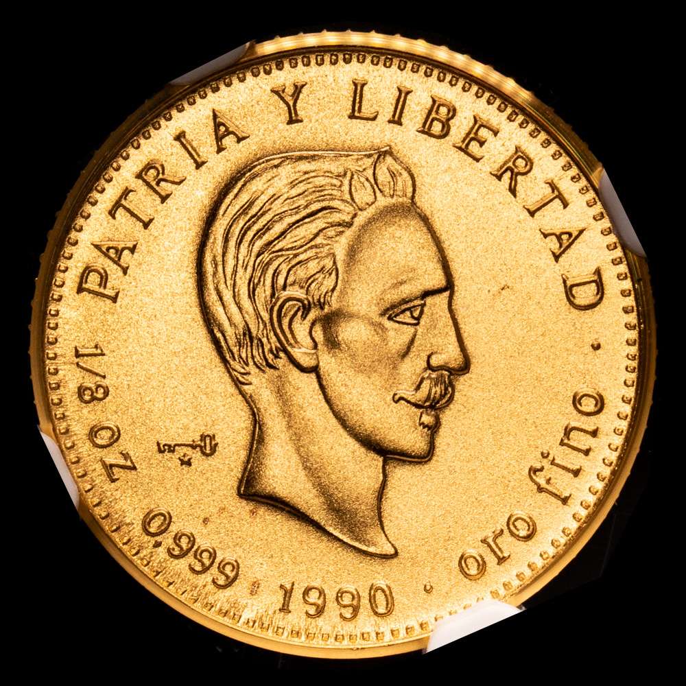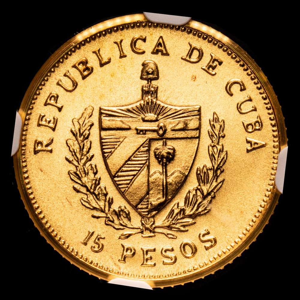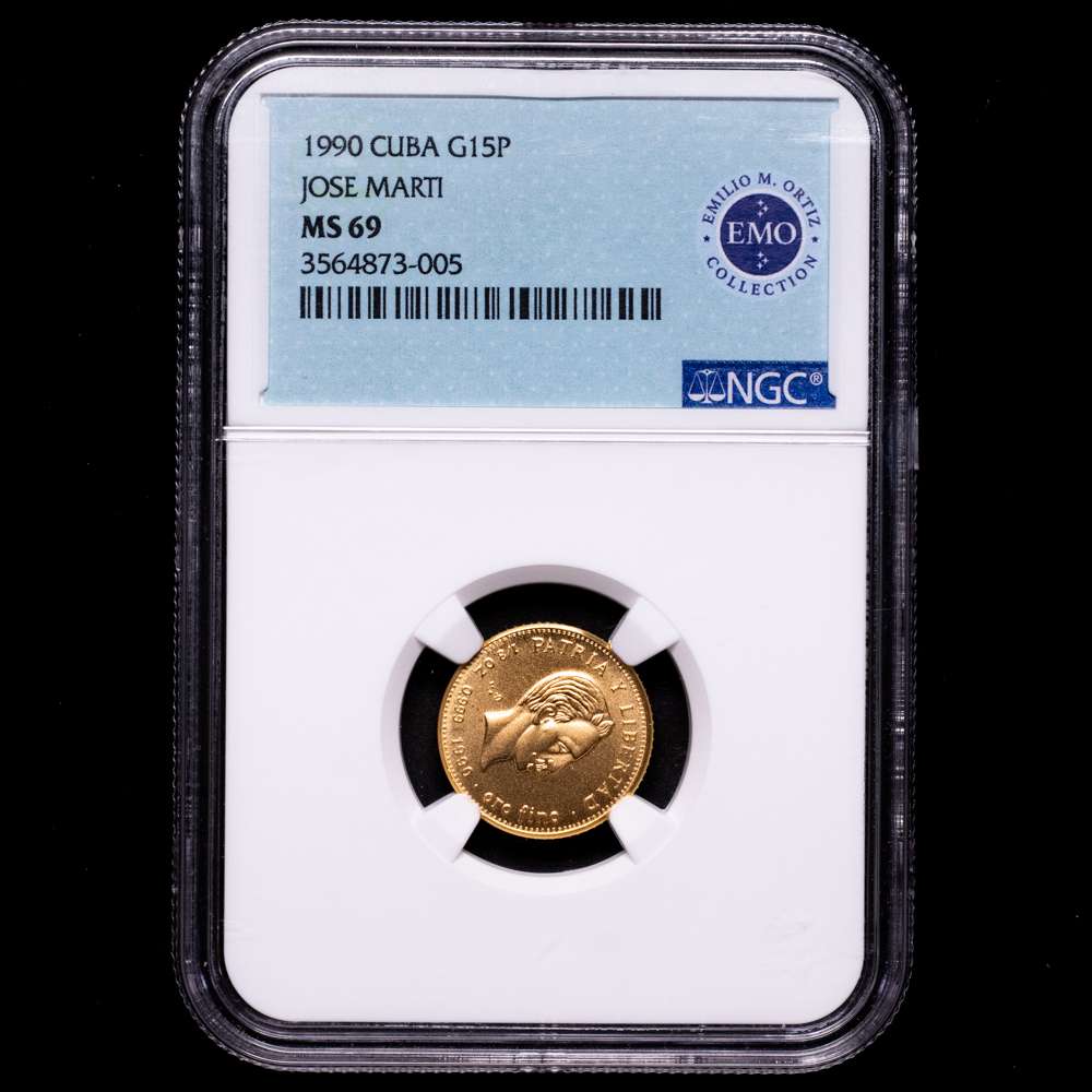 CUBA, Casa de la Moneda de La Habana, 15 pesos de oro, 1990, José Martí, NGC MS 69 Ultra Cameo (Etiqueta de la Colección EMO). KM-212; Fr-23. Acabado esmerilado perfecto, de una tirada reportada de solo 15 piezas. (Nota: La moneda está rotada en la cápsula). Procedente de la Colección Emilio M. Ortiz de Monedas de Oro Cubanas.