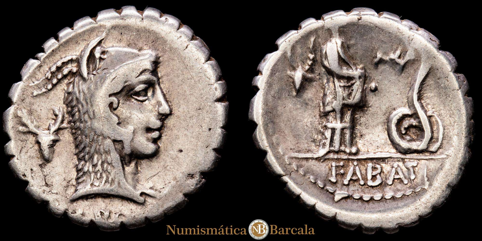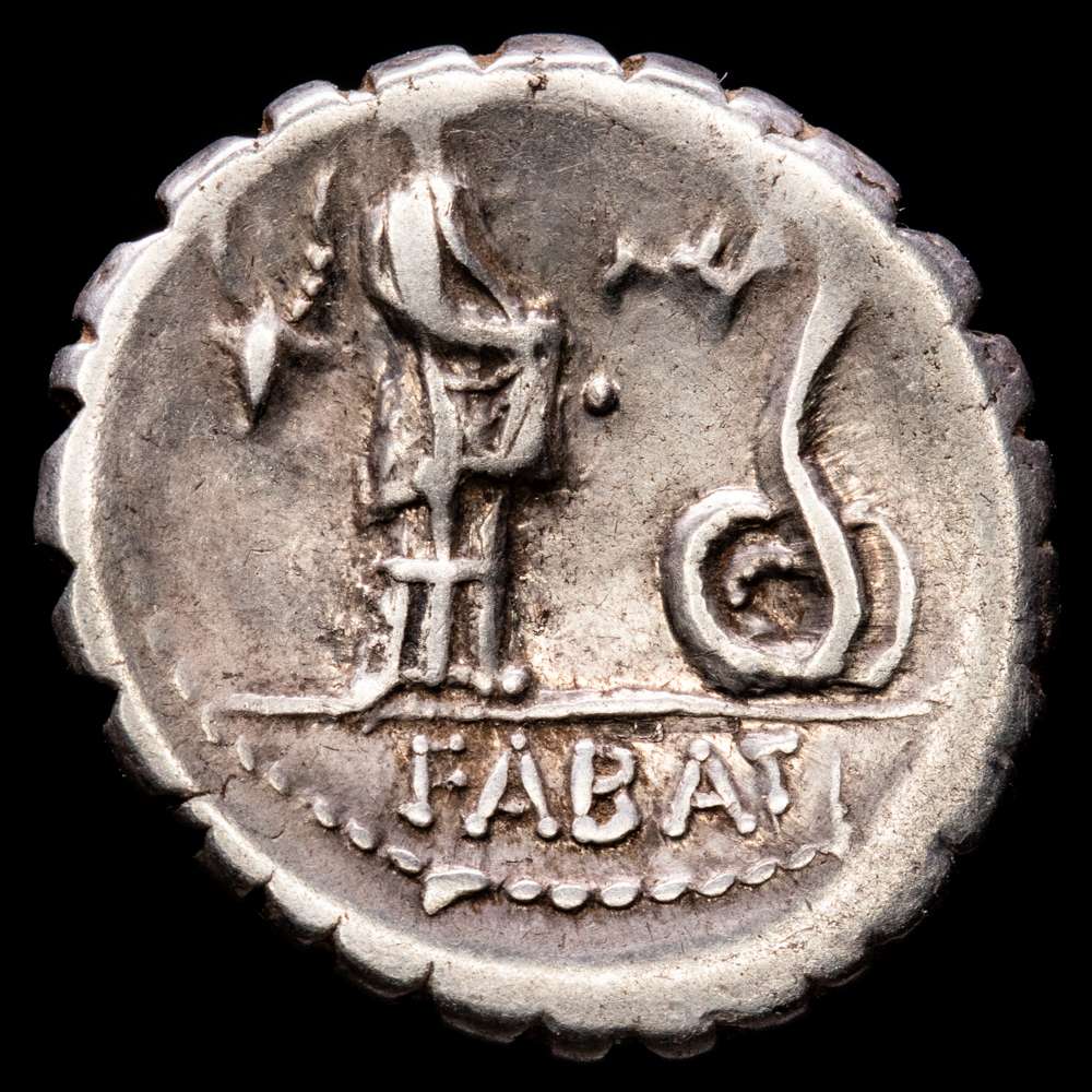 Denario. 64 a.C. ROSCIA. L. Roscius. Anv.: Cabeza de Juno Sospita tocado con piel de cabra a derecha, detrás cabeza de ciervo, debajo (L. ROSCI). Rev.: Muchacha dando de comer a una serpiente, cabeza de ciervo en campo. En exergo: FABATI. 3,78 grs. AR. Par de símbolos nº 84 de Crawford. BMC-3394-10; Cal-1231; Craw-412/1; FFC-1090; Se-3. MBC.