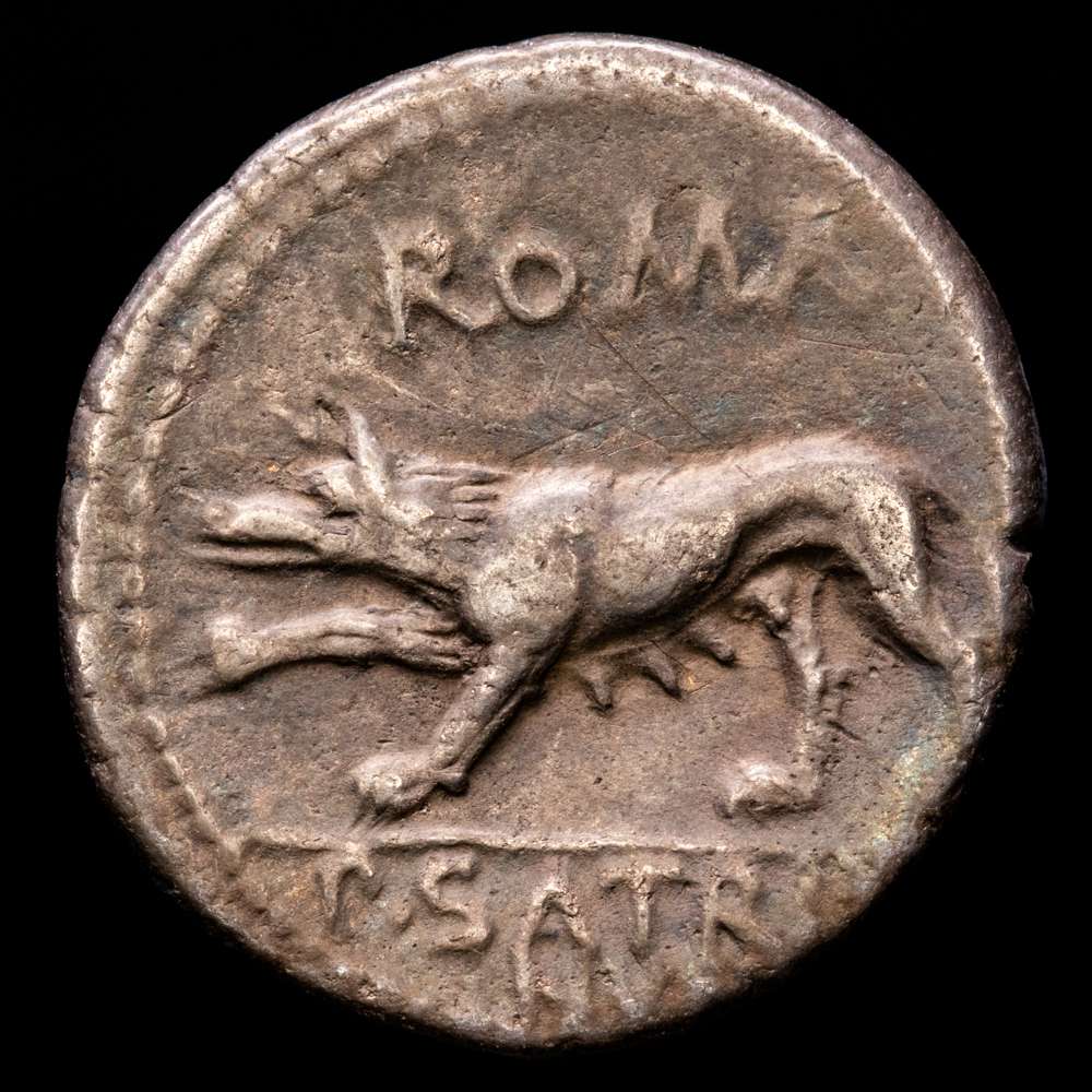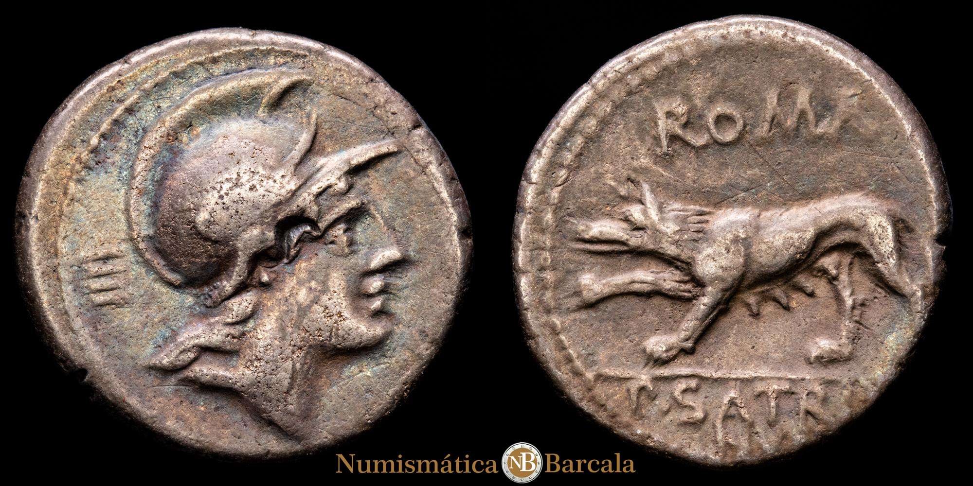 Denario. 77 a.C. SATRIENA. P. Satrienus. ESCASA. Anv.: Cabeza de Marte a derecha, detrás número IIII. Rev.: Loba a izquierda, encima ROMA. En exergo P. SATRIE / NVS. 3,54 grs. AR. Pátina. Con pedigree Ferencz Jozsef, Budapest 1905. Ex UBS. 15 Septiembre 1998, n. 600. BMC-3209-37; Cal-1243; Craw-388/1b; FFC-1097; Se-1. MBC+.