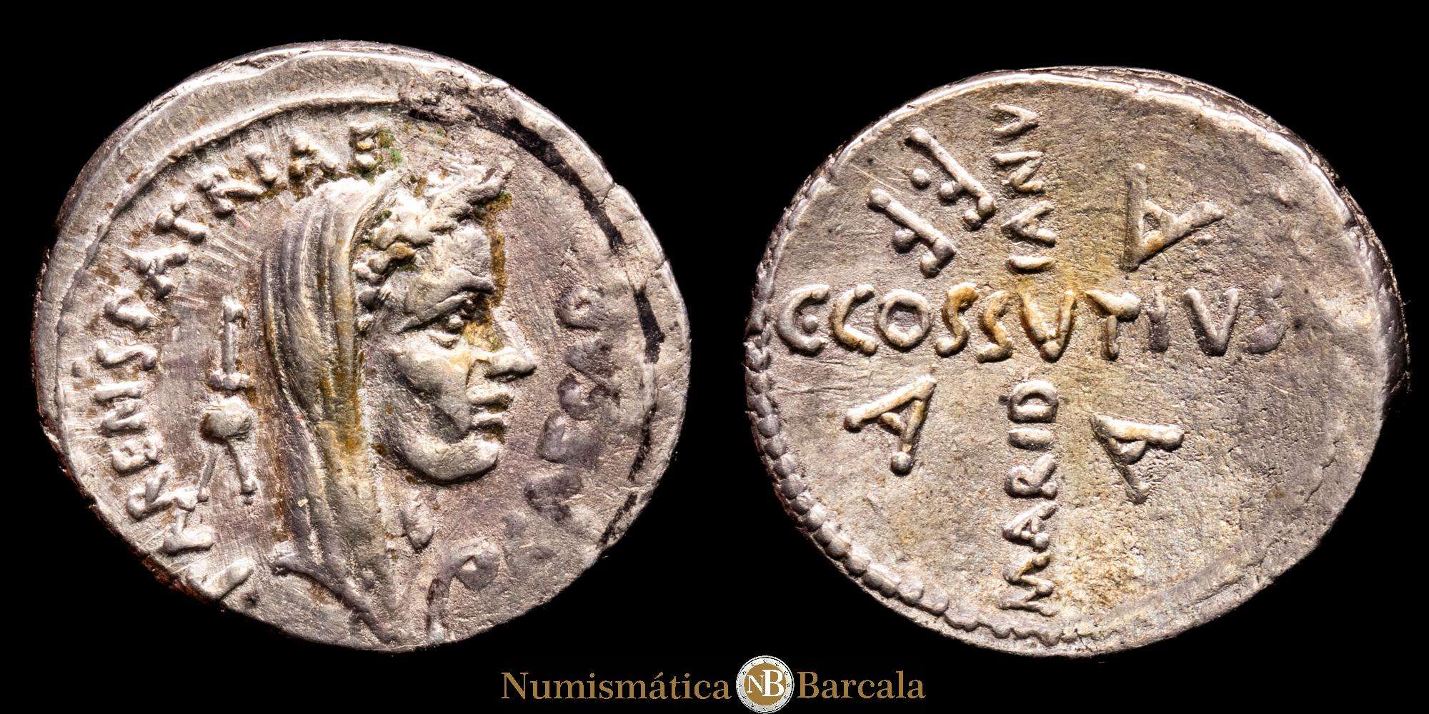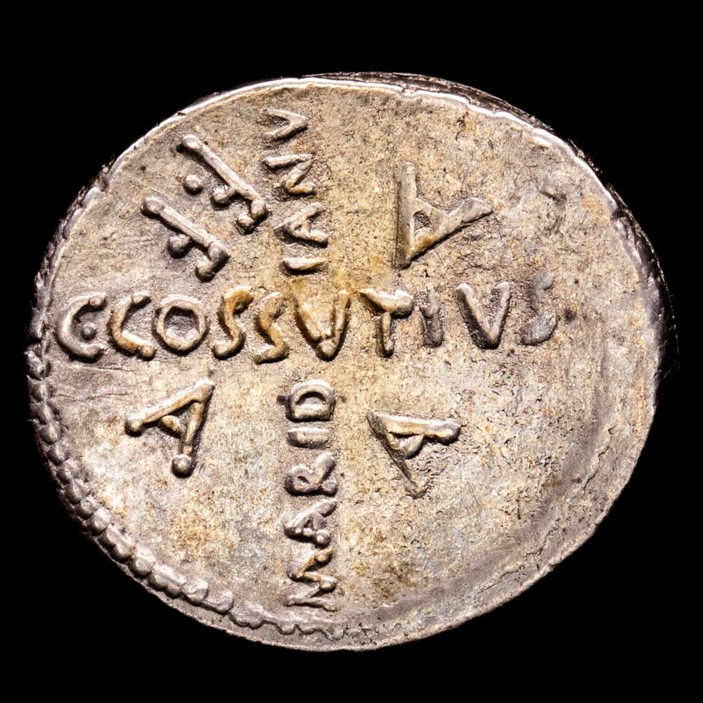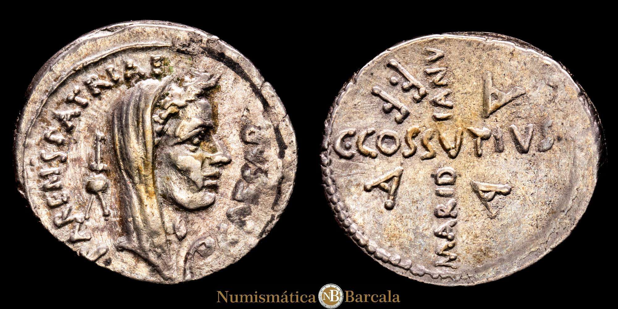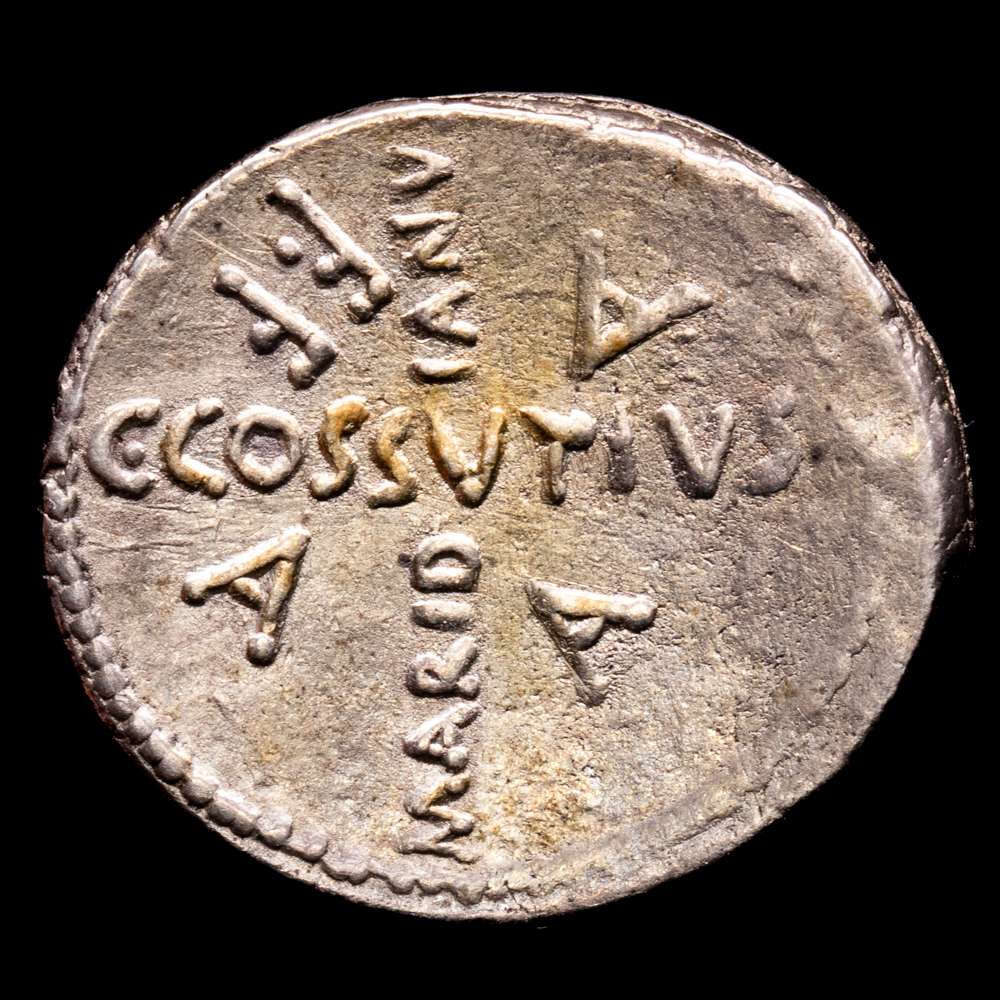 Cayo Cossucio Maridiano fue aparentemente el último hombre designado para el recientemente ampliado cuatrovirato de monetarios en el año 44 a. C. Todas sus cabezas de César están veladas, en alusión a su función como Pontífice Máximo. Esta emisión es el último tipo de retrato de César acuñado en el año 44 a. C. y, según David R. Sear, es «claramente póstuma, presumiblemente de mediados de abril».