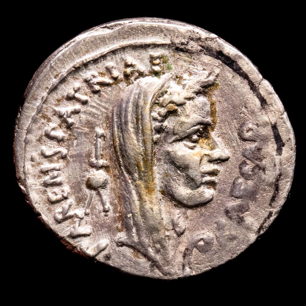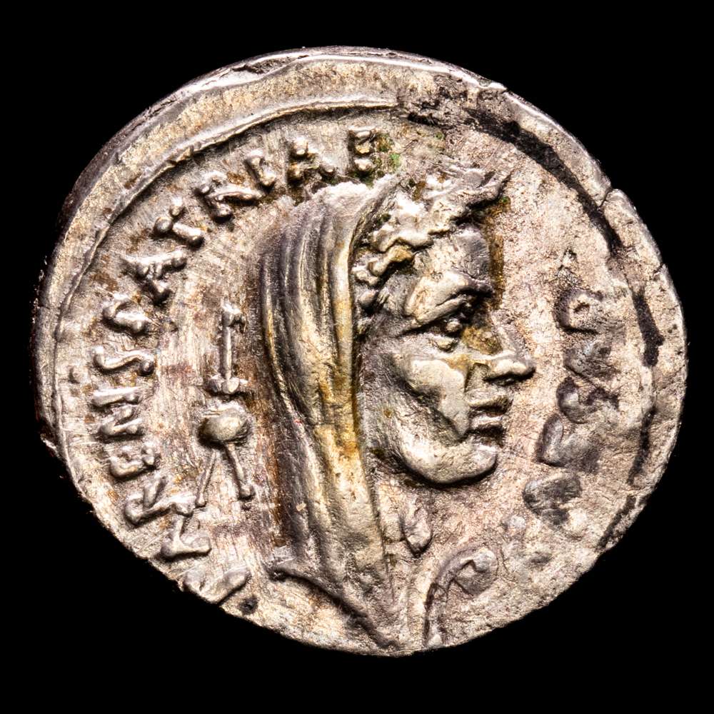 Denario. Acuñada el 44 a.C. JULIO CÉSAR. C. Cossutius Maridianus. Anv.: CAESAR PARENS PATRIAE. Cabeza velada y laureada de Julio César a derecha, detrás bonete de flamen y delante lituo. Rev.: C. COSSVTIVS MARIDIANVS A.A.A.F.F. 3,96 grs. AR. C-8; Craw-480; BMC-4187; RRC-109. Escasa. VF.