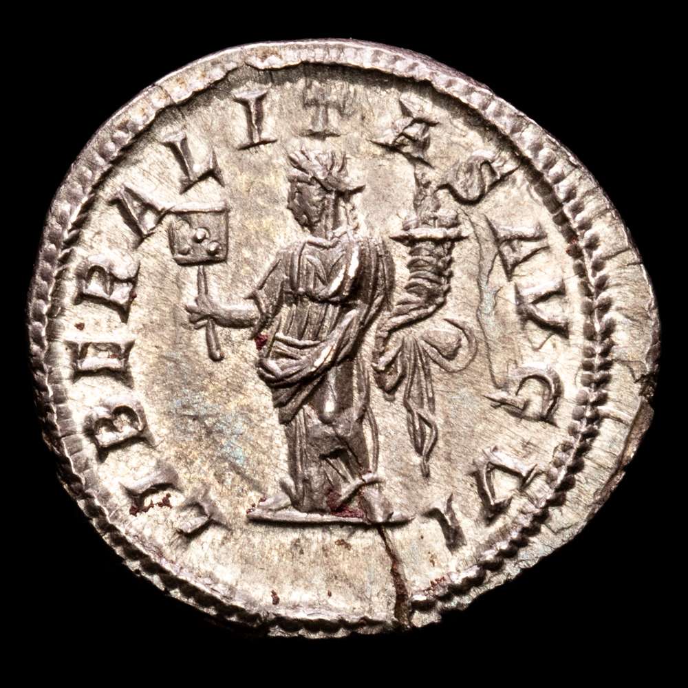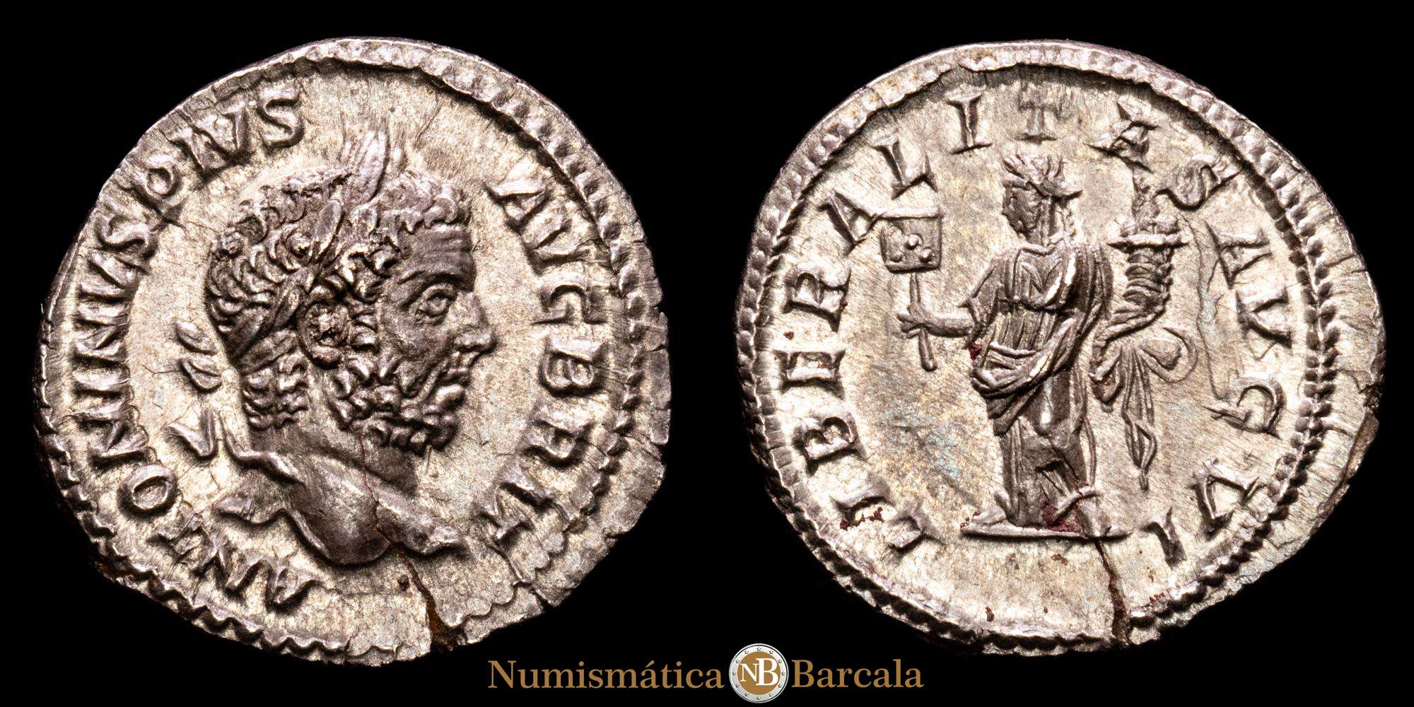 Denario; Geta como Augusto; 209-211 d. C., Roma, 211 d. C., Denario, 3,15 g. (S.6815, RIC 216, RSC 129). Anv.: P SEPT GETA – PIVS AVG BRIT. Cabeza laureada a la derecha. Rx: LIBERALITAS AVG VI alrededor, Liberalitas de pie a la izquierda, sosteniendo un contador de monedas y una cornucopia. Conmemora la generosidad de Geta para ascender al trono durante el breve reinado conjunto con Caracalla. Bella pátina de monetario antiguo. De la Colección Doctor B. EBC+.