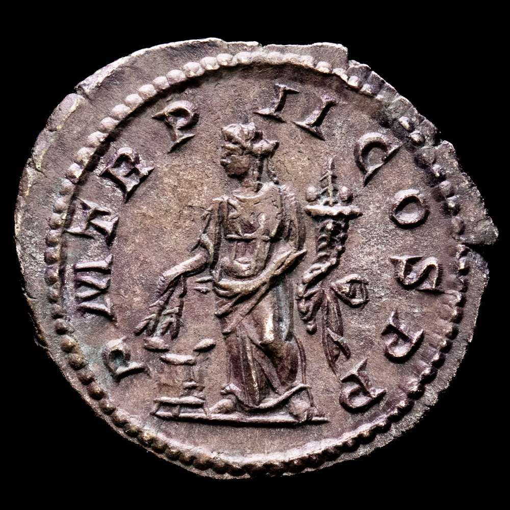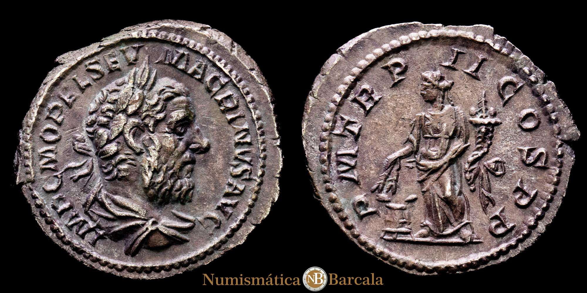 Macrino, 217-218. (Plata, 21 mm, 3,61 g, 12 h), Roma, marzo-junio de 218. IMP CM OPEL SEV MACRINVS AVG Busto laureado y con coraza de Macrino a la derecha. Reverso: PM TR P II COS PP Annona de pie de frente, con la cabeza girada a la izquierda, sosteniendo espigas de trigo en la mano derecha y una cornucopia en la izquierda; a sus pies, a la izquierda, un modio con espigas de trigo. BMC 43. Cohen -. RIC 26. Con una bonita pátina, un ejemplar muy atractivo. En excelente estado. XF.