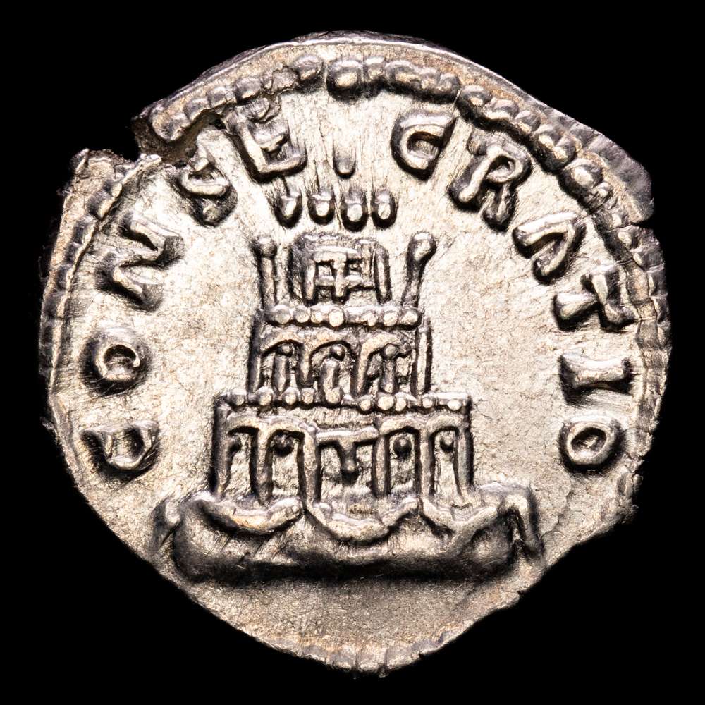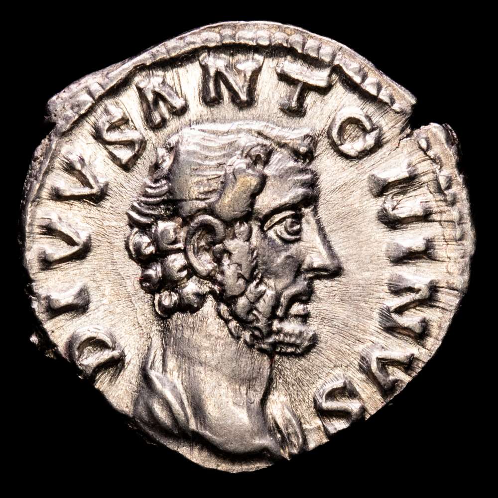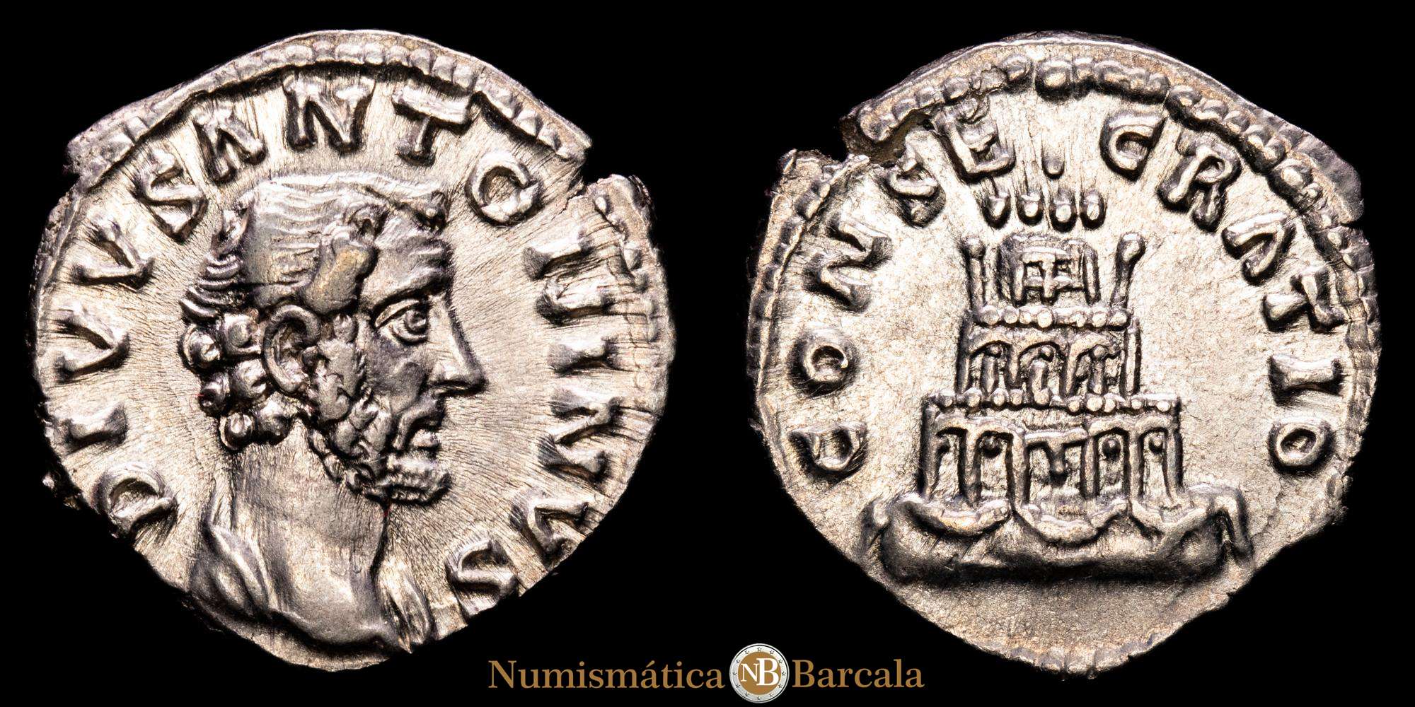 DIVUS ANTONINUS PIUS, 138-161 dC. Denario. Roma. Acuñadas durante el reinado de Marco Aurelio. Anv.: DIVVS ANTONINVS. Busto con la cabeza descubierta a la derecha, con un ligero manto. Rev.: CONSECRATIO. Pira funeraria de cuatro niveles con guirnaldas y coronada por una cuadriga enfrentada. RIC 438 (Aurelio). Peso: 3,2 g. Diámetro: 18 mm.