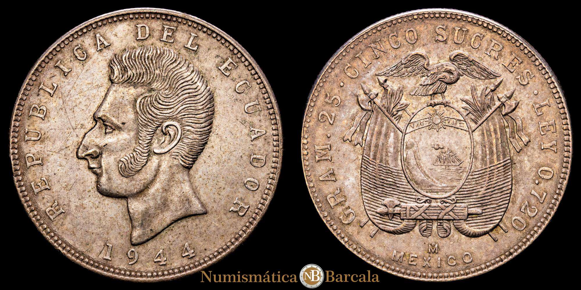 Ecuador. 1944. (México). 5 sucres. (KM. 79). AG. 25,04 gramos. EBC+. cantidad