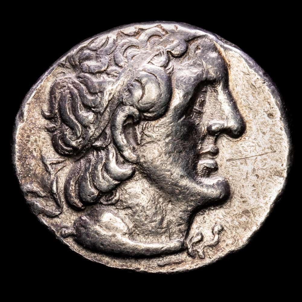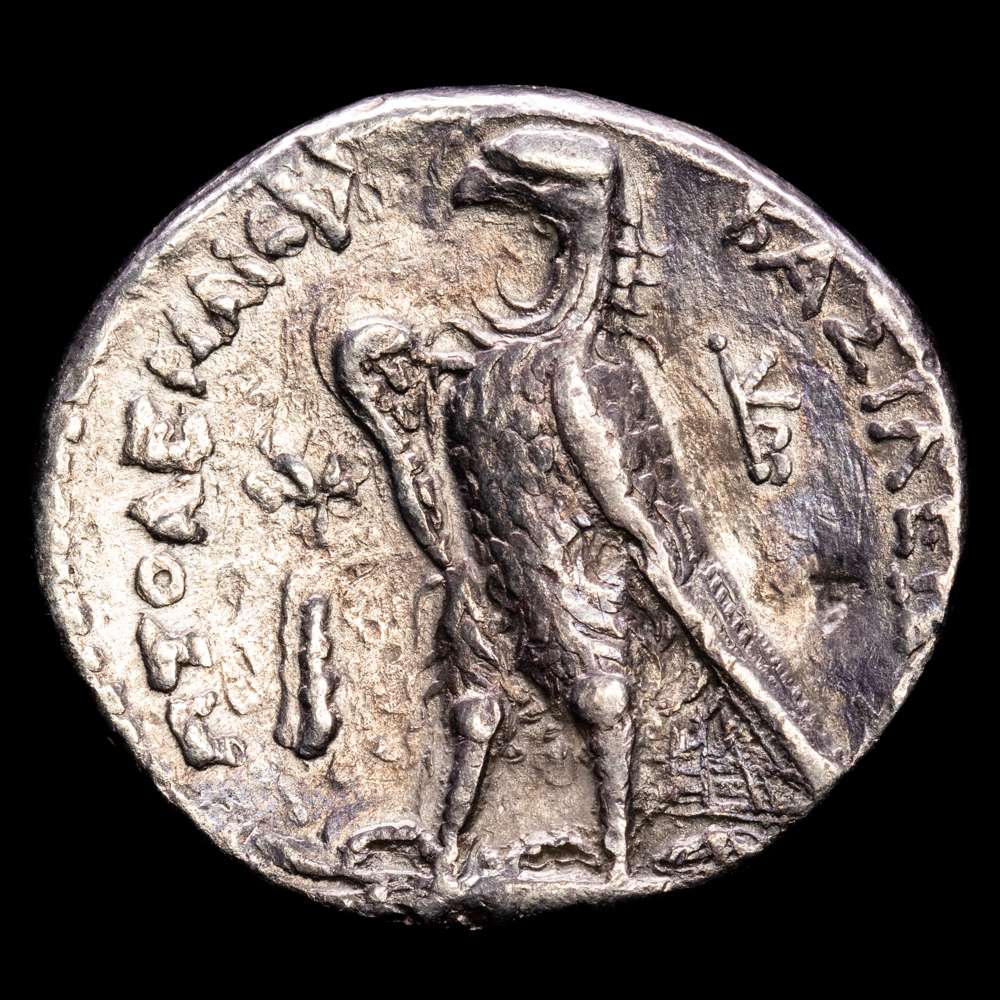 Anverso: cabeza con diadema de Ptolomeo I a la derecha, con égida alrededor del cuell. Reverso: águila con las alas cerradas de pie a la izquierda sobre un rayo, monograma cívico sobre un garrote a la izquierda.