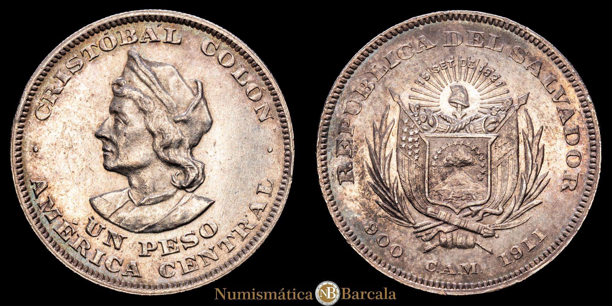 Numismática Barcala > Productos > El Salvador. 1 pesito. 1911. CAM. (Km-115,1). (25,06 g.). Ag. Parte del brillo original. Bella pátina de monetario. EBC.