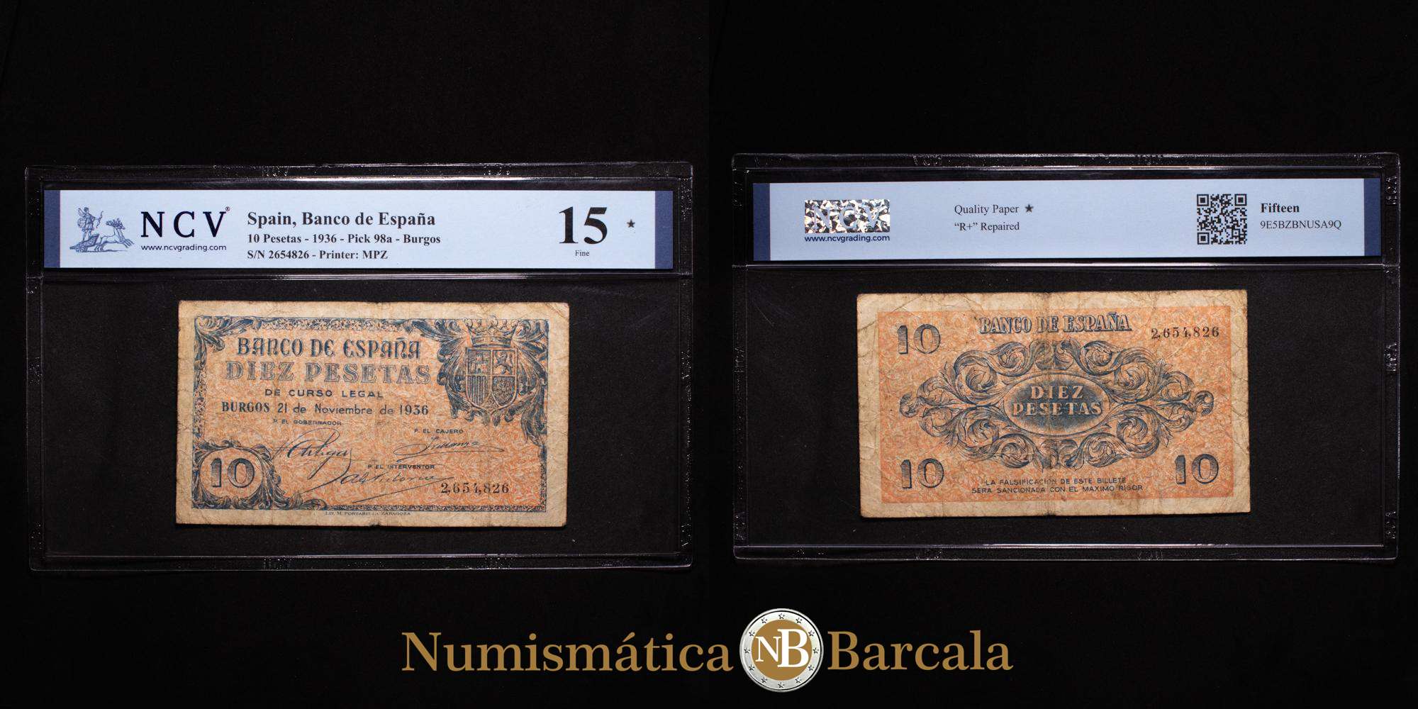 Numismática Barcala > Productos > España – Banco de España. 10 Pesetas. Burgos. 1936. MPZ. Pick 98a. 15 Fine. Raro.