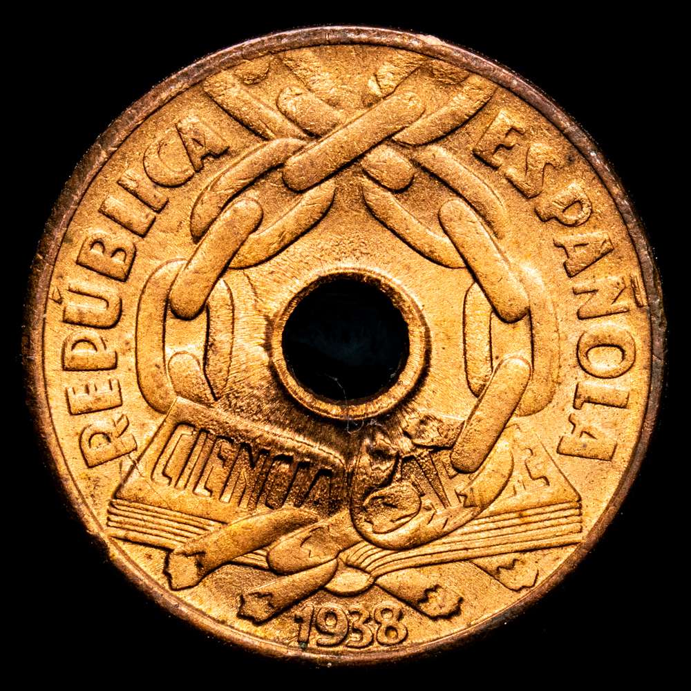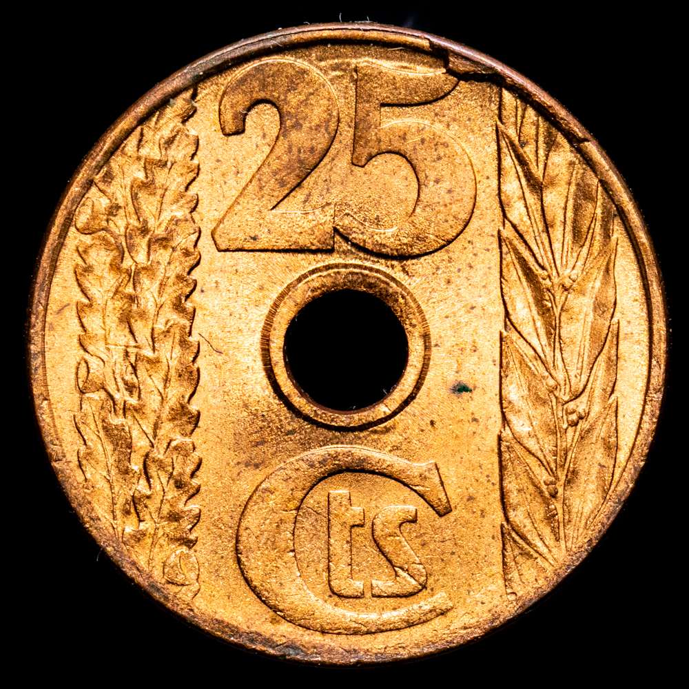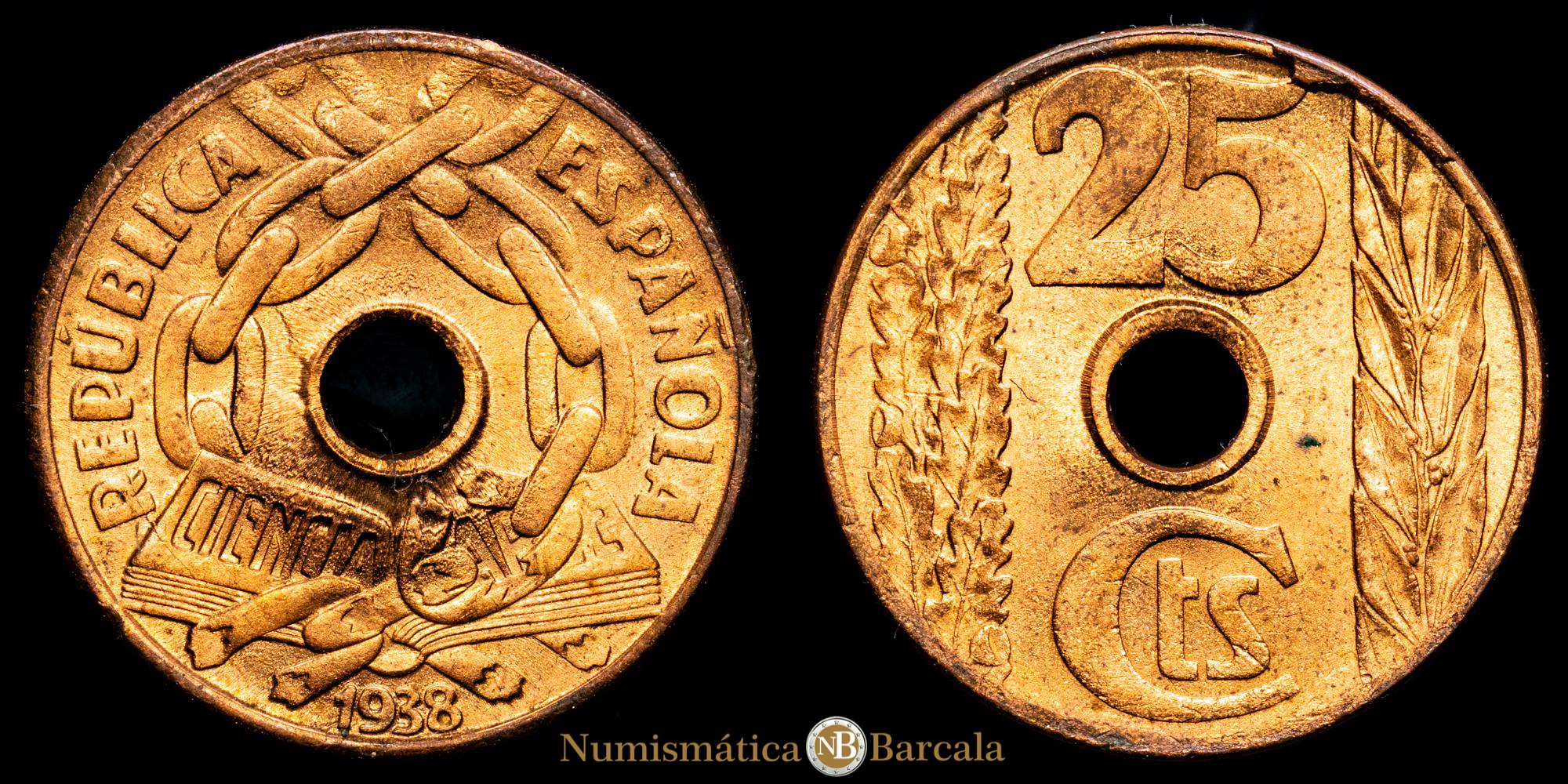 España II República. 25 Céntimos. (4,88 g.). Madrid. 1938. Aureo y Calicó-20. SC. Brillo original. Muy bella