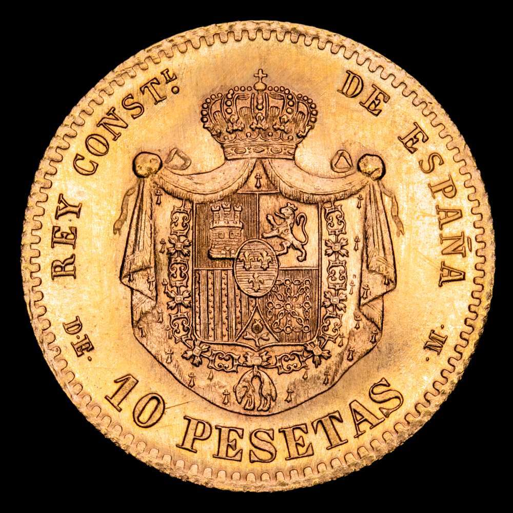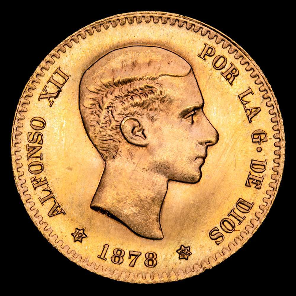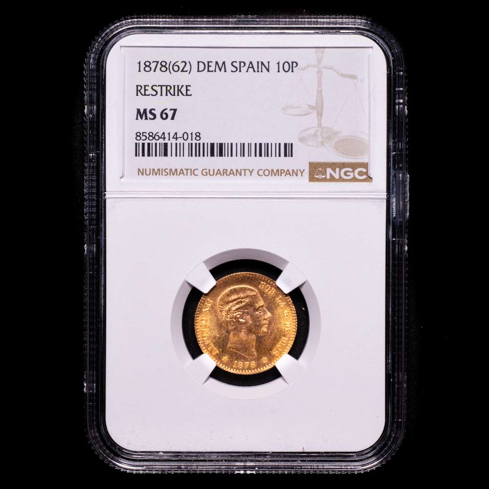 Estado Español (1936-1975). ALFONSO XII. 10 pesetas. 1878*19-62. Madrid. DEM. (Cal-168). Au. 3,23 g. Reacuñación oficial. Brillo original. Encapsulado por NGC MS 67.
