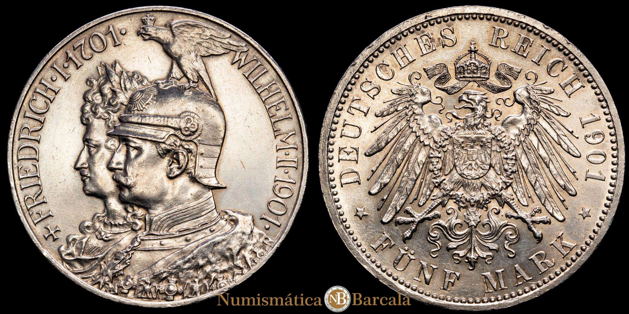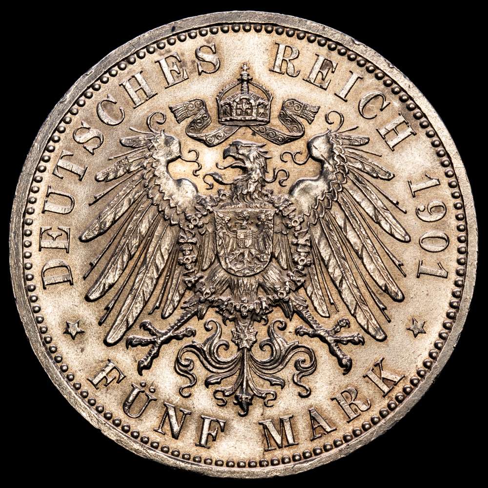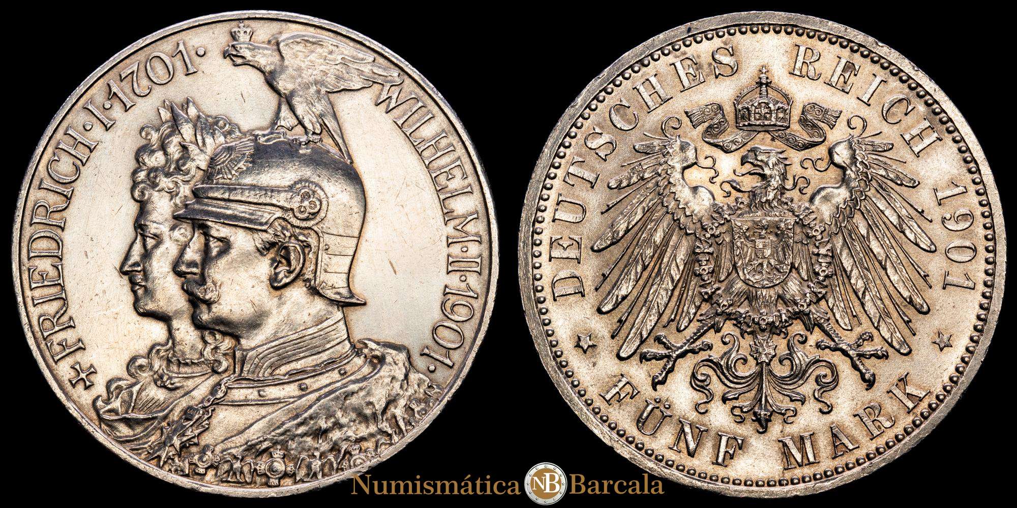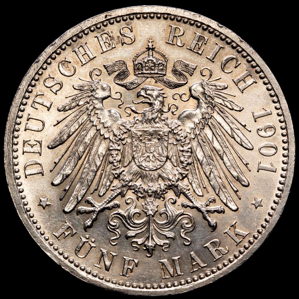 ESTADOS ALEMANES. 5 Marcos. 1901. Guillermo II. Prusia. 27,80 grs. AR. (Limpiada). KM-523. EBC.