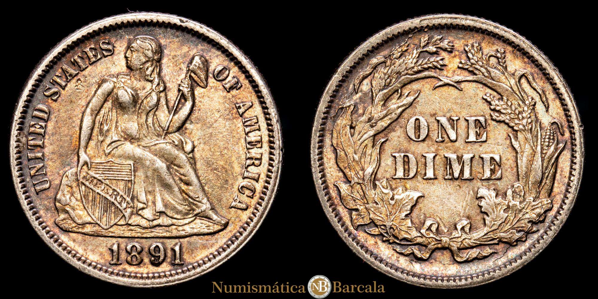 Numismática Barcala > Productos > Estados Unidos de América. One dime. (2,49 g.). 1891. KM-A-92. XF+. 18 mm. Pátina