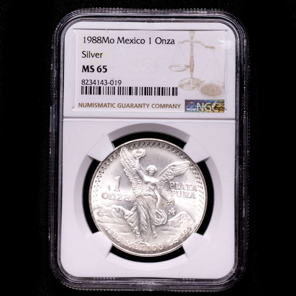 Numismática Barcala > Productos > Estados Unidos Mexicanos. 1 Onza. (31,1 g.). México. 1988. KM-613. Encapsulada por NGC como MS65.