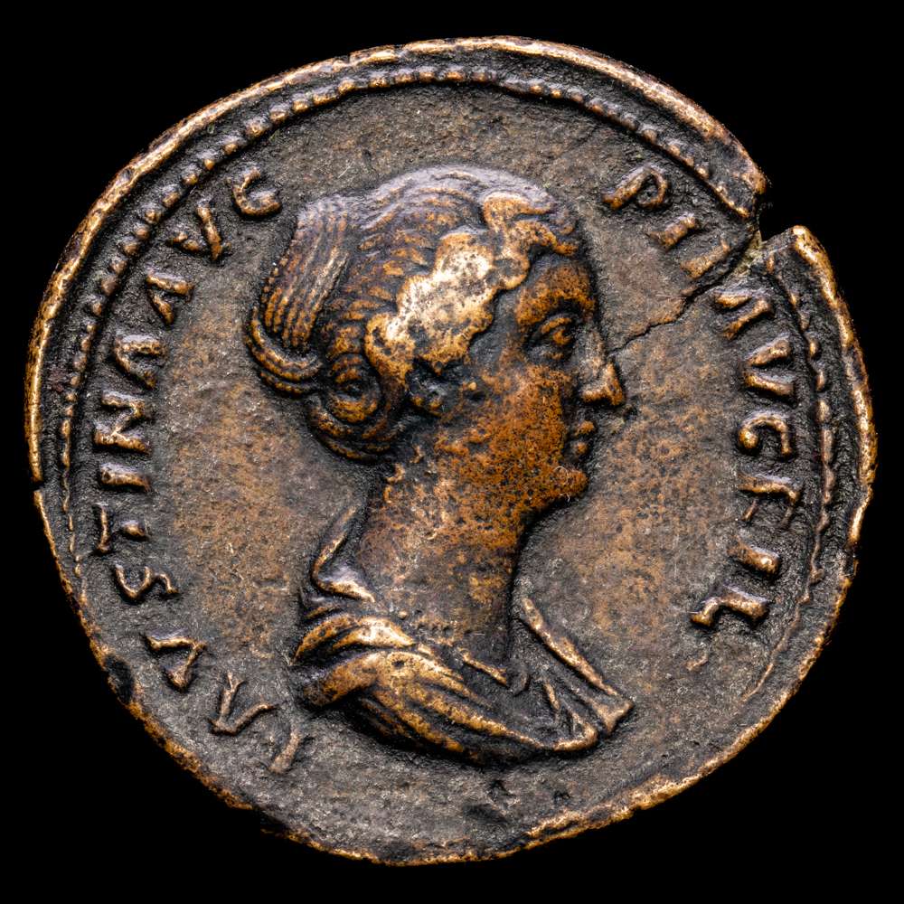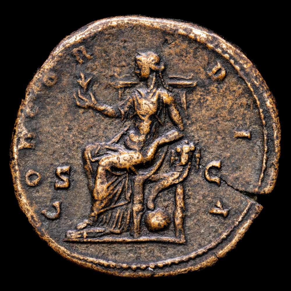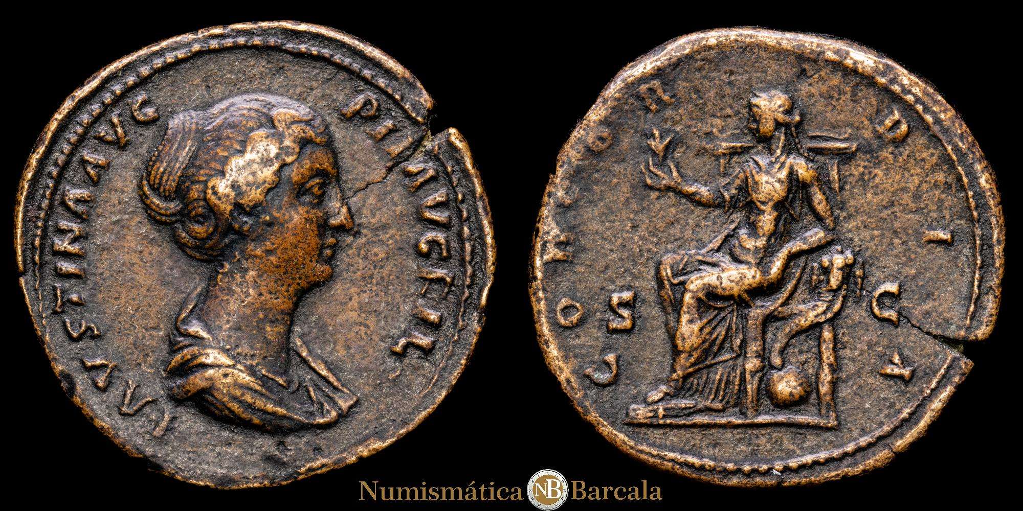 Faustina II. Sestercio. (22,49 g.). Roma. 147-175 d.C.. RIC 1374a (Pío); Banti 33. VF+. Busto drapeado a la derecha / CONCO R DIA, SC, bajo campo, Concordia, drapeada, sentada a la izquierda en el trono, sosteniendo una flor en la mano derecha, con el codo izquierdo apoyado en el brazo del trono; a la derecha, cornucopia sobre globo terráqueo.
