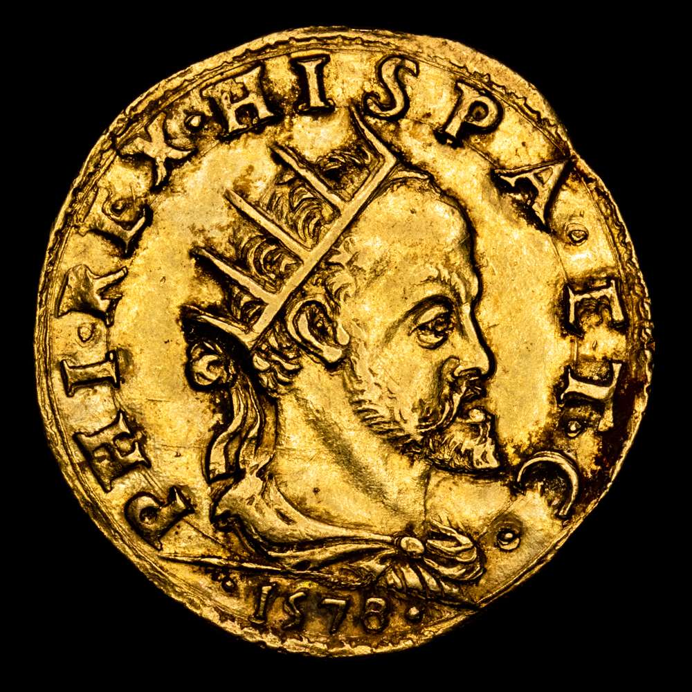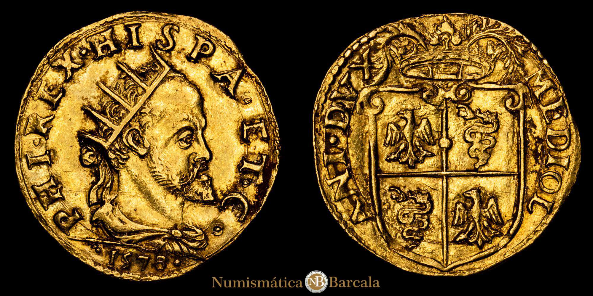 Numismática Barcala > Productos > Felipe II. 1 Doppia. (6,63 g.). Milán. 1578. VTI-65. EBC. Restos de brillo original. Rara asi