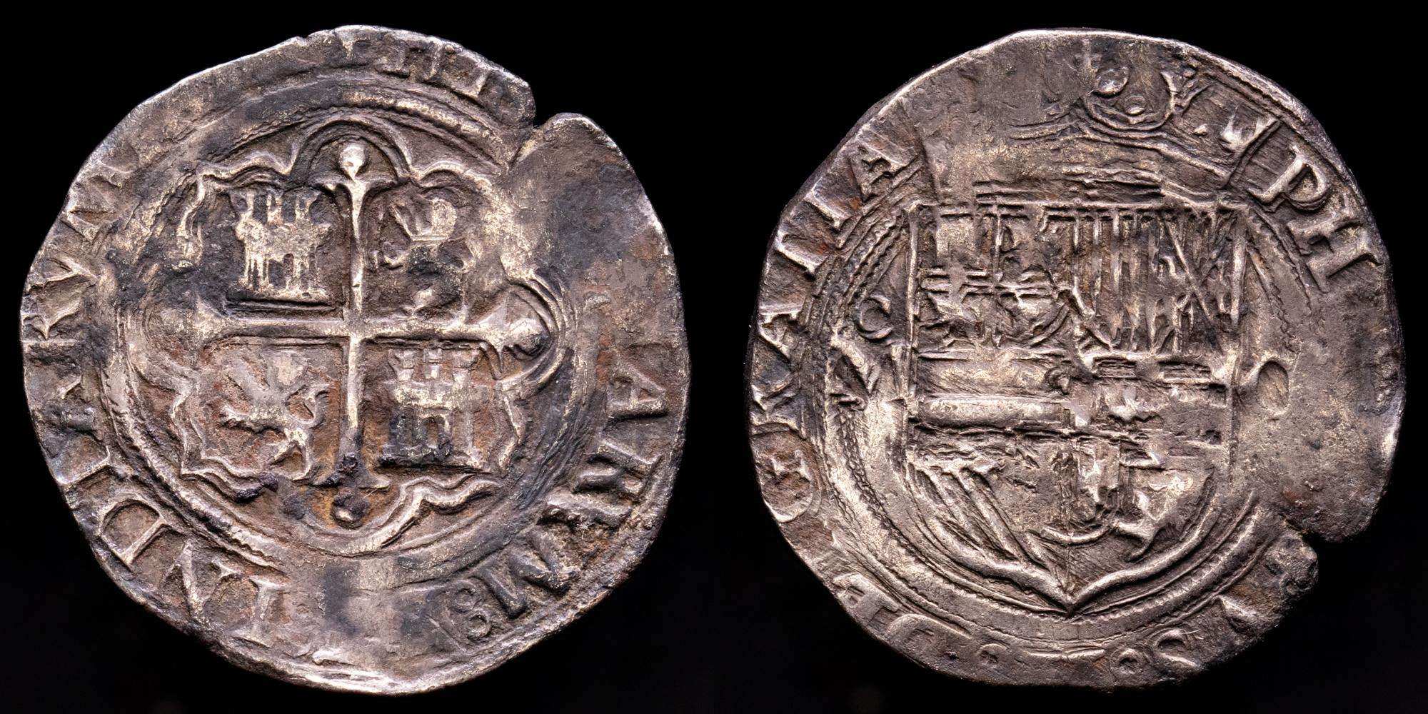 Numismática Barcala > Productos > Felipe II (1556-1598). 1 real. ND (1572-1589). México. O. (Cal-224). Ag. 3,37 gramos. Visible parte del nombre del rey. Pátina. MBC.