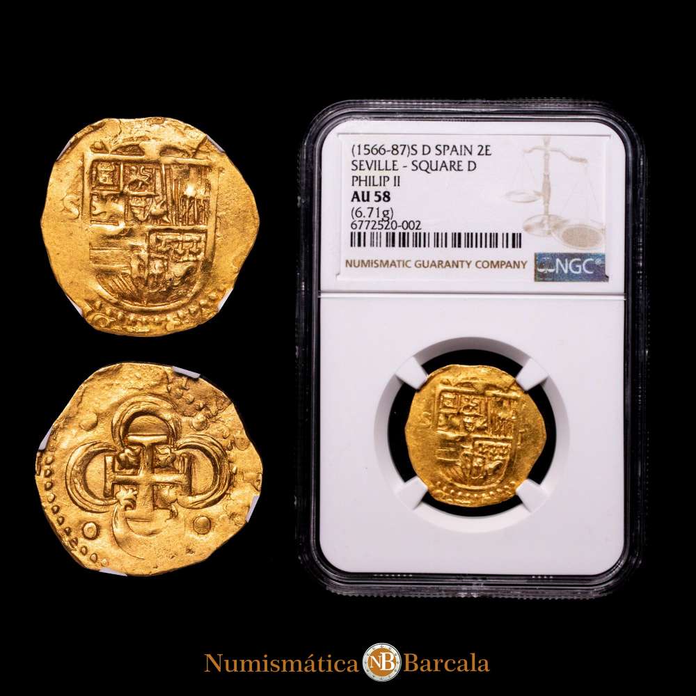 Numismática Barcala > Productos > Felipe II (1556-1598). 2 escudos. ND. Sevilla. (Cal-Tipo 257). Au. 6,71 gramos. Ensayador d cuadrado. Ceca y ensayador a izquierda del escudo. Rara. Encapsulada por NGC como AU 58.
