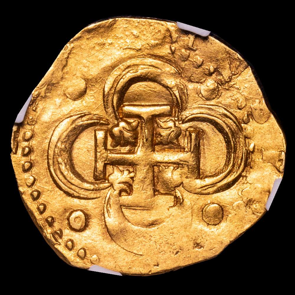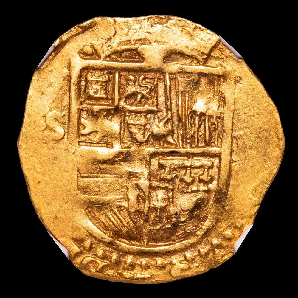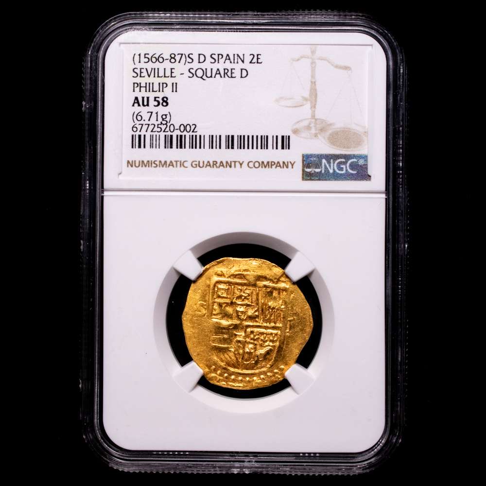 Numismática Barcala > Productos > Felipe II (1556-1598). 2 escudos. ND. Sevilla. (Cal-Tipo 257). Au. 6,71 gramos. Ensayador d cuadrado. Ceca y ensayador a izquierda del escudo. Rara. Encapsulada por NGC como AU 58.