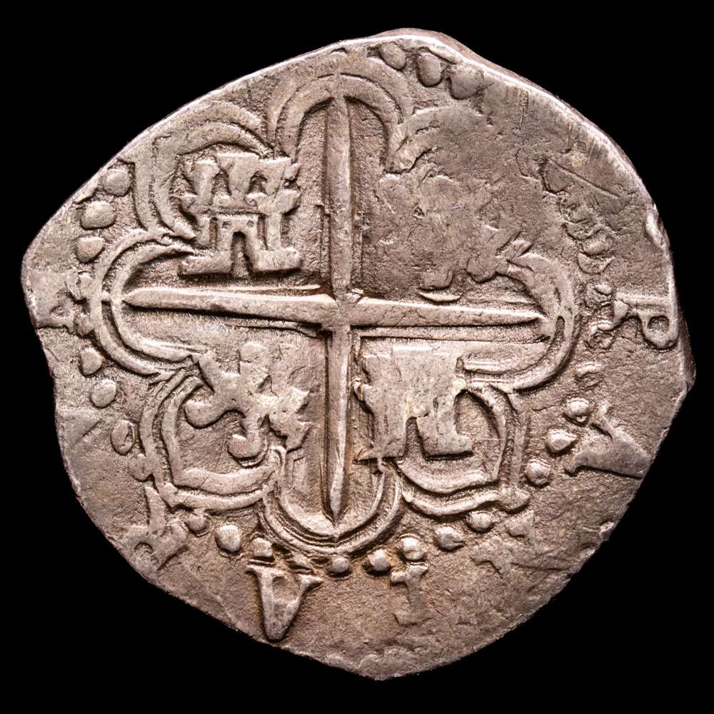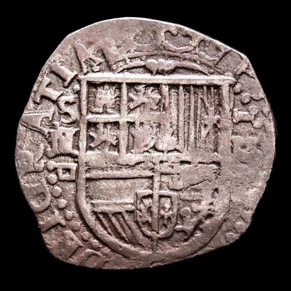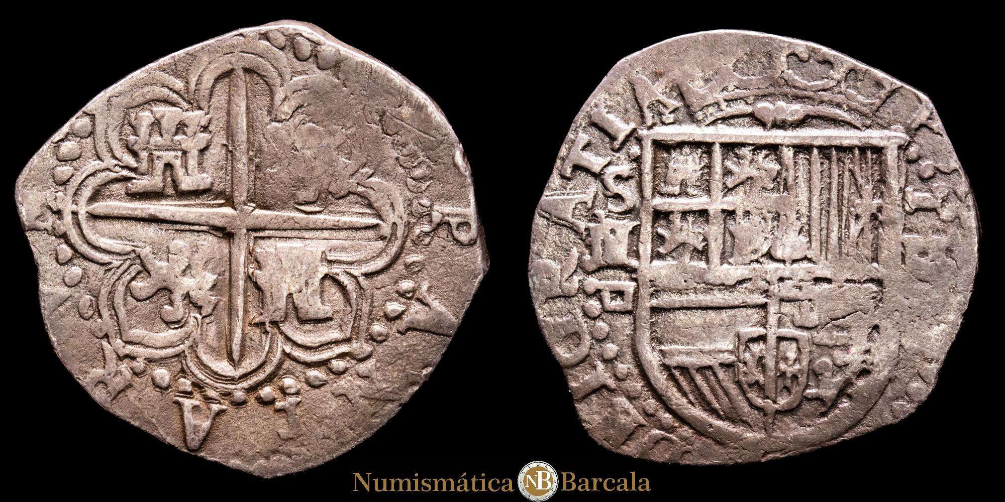 Numismática Barcala > Productos > Felipe II (1556-1598). 2 reales. Sevilla. Cal-(407-411)? Tipo 137. Ag. 6,72 g. S/II/d cuadrada a izquierda. XF.
