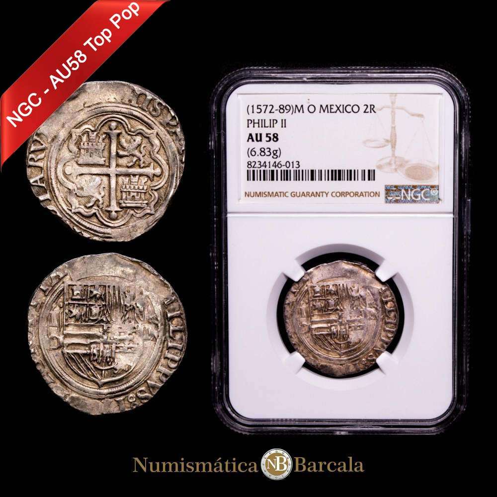 Numismática Barcala > Productos > Felipe II (1556-1598). 2 reales. Sin fecha. México. M. (Cal-356).(6.83 g.). Catalogada por NGC como AU 58 (Top Pop) , la mejor conocida en el censo de NGC.