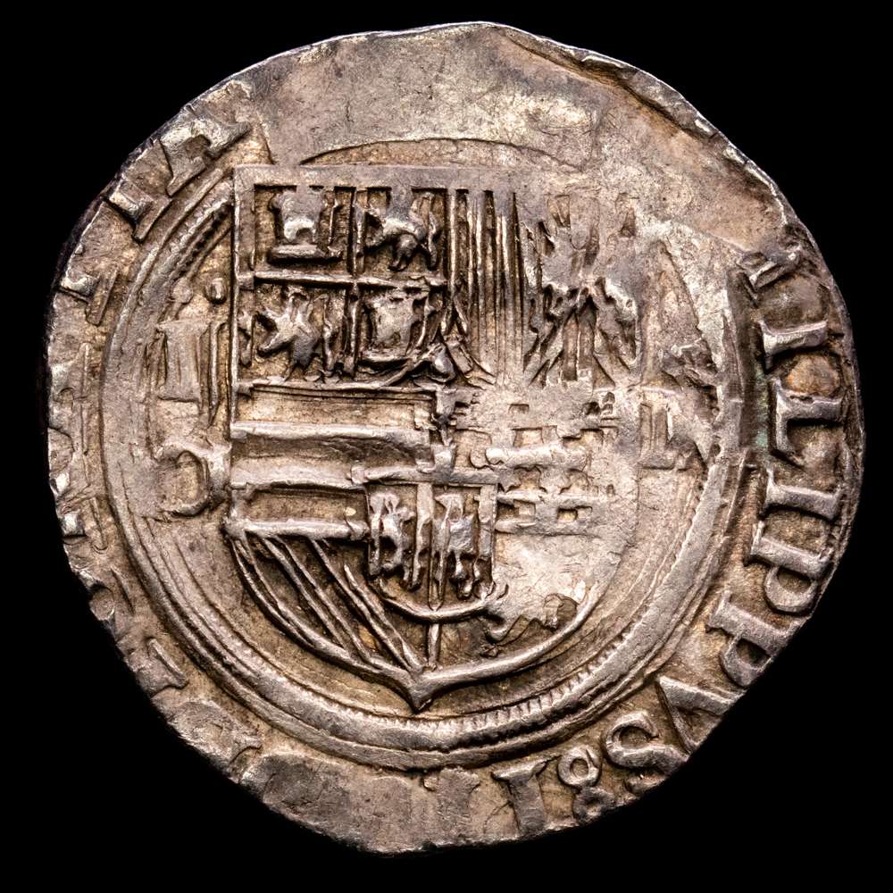 Magnifica acuñación ,ensayador O perfectamente claro y ceca Mo, perfectamente visibles en anv: nombre del Rey y el ordinal (P)HILIPPVS II DEI GRATIA y en rev: HISPANIARVM. Pátina oscura. Excelente pieza.