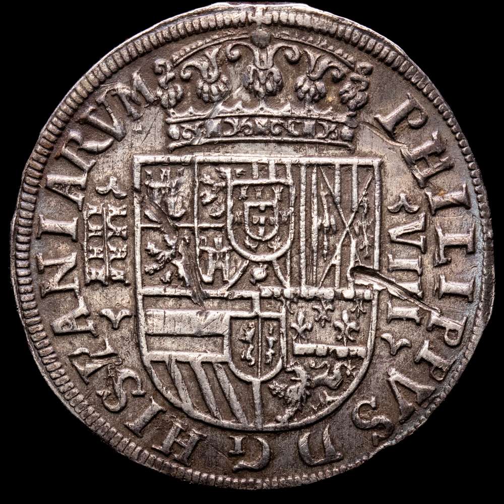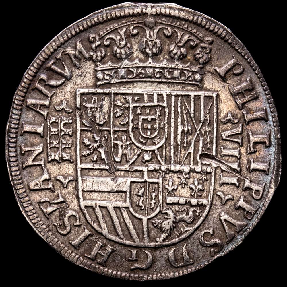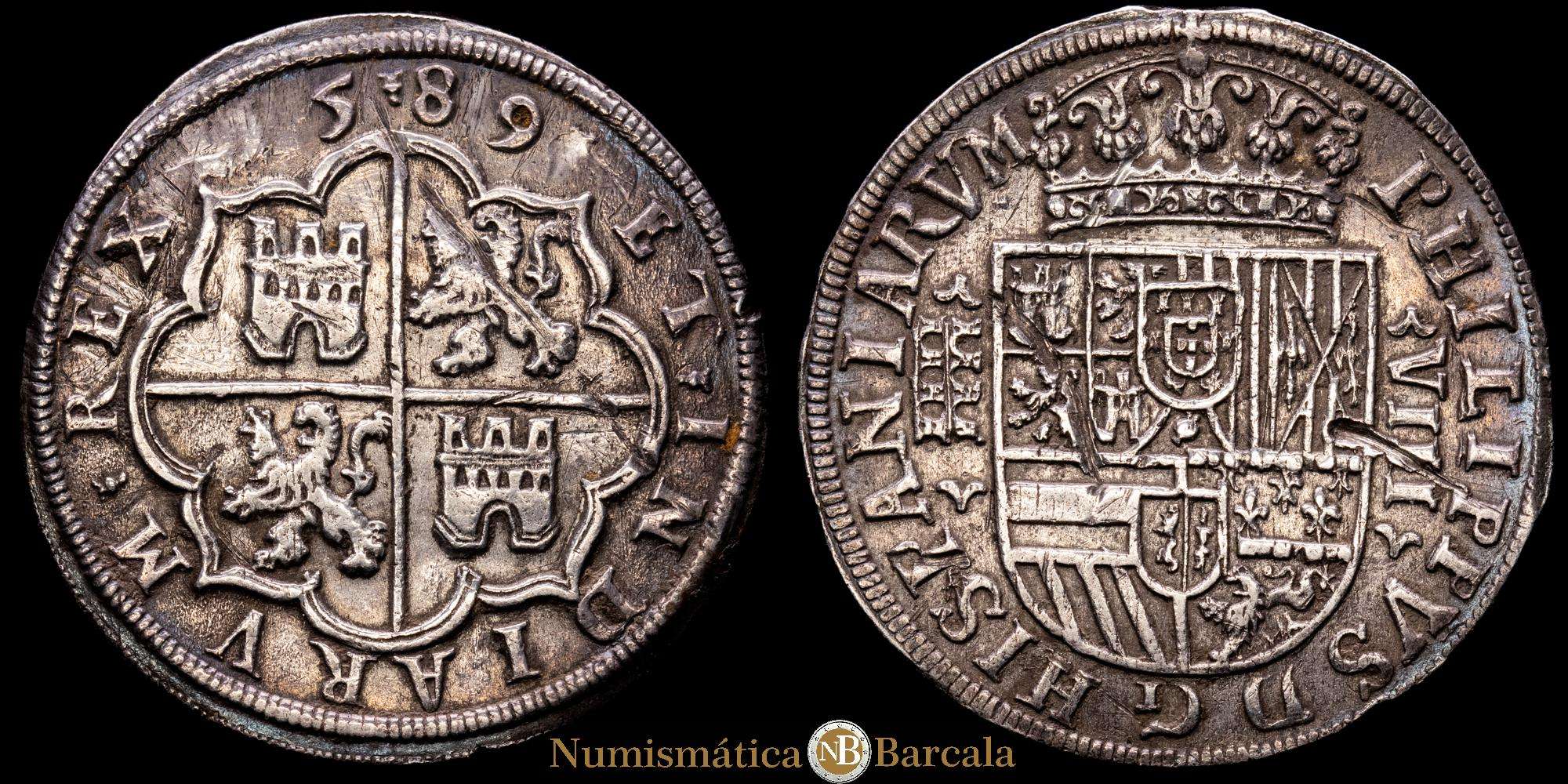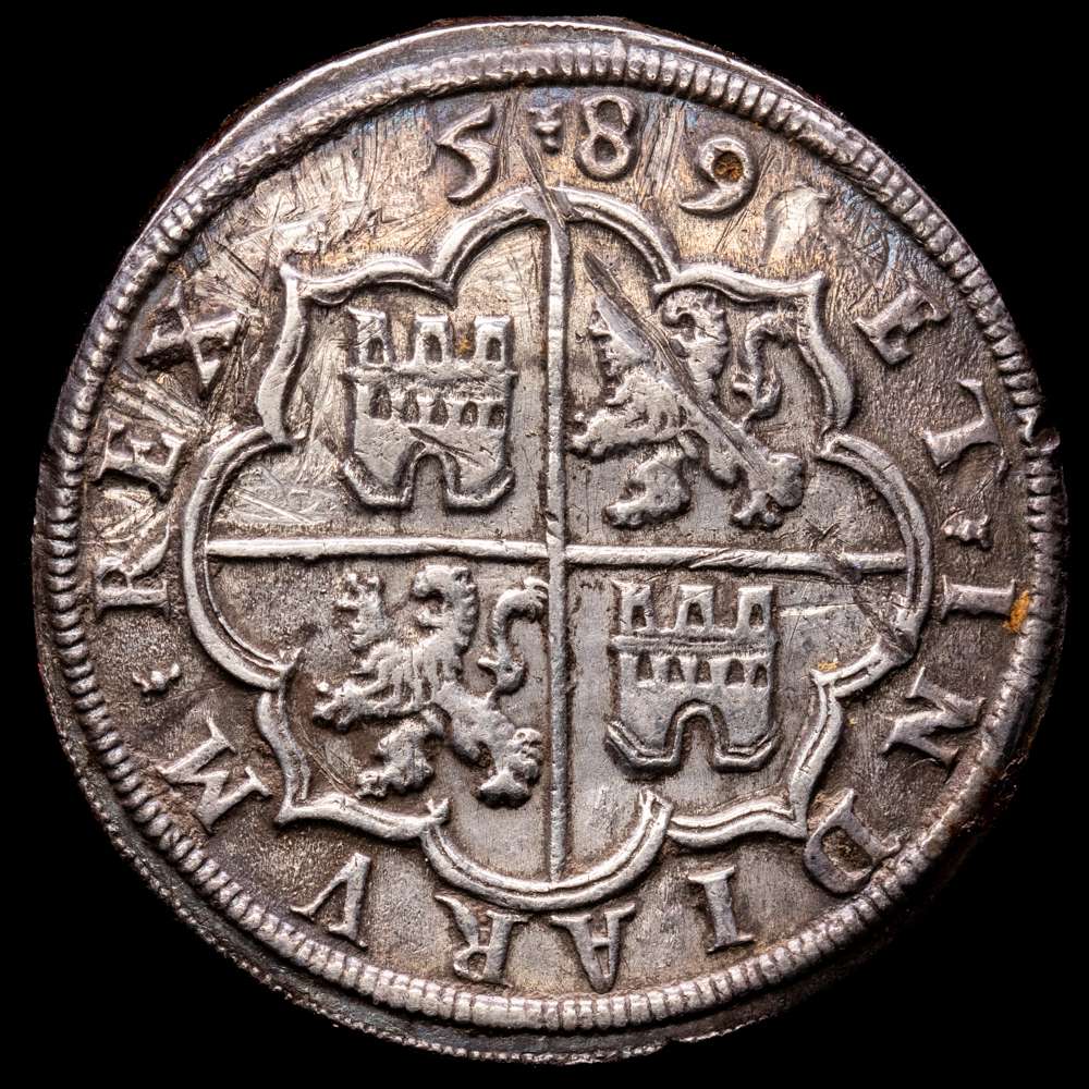 Felipe II (1556-1598). 8 reales. 1589. Segovia. (Cal-713). Ag. 27,05 gramos. Acueducto de 3 arcos y 2 pisos. Rayas, (el 1 de la fecha raspado aun así bonito ejemplar). MBC+. Bonita pátina. Rara.