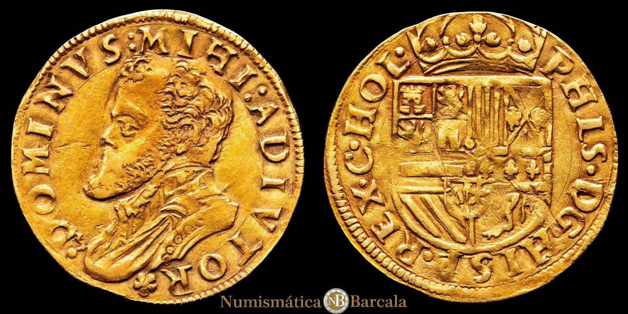 Felipe II. (1556-1598). Dordrecht. 1/2 real de oro. (Vti. 1392) (Vanhoudt 262.DO). Bonito color. 3,48 gramos. VF. Rara.