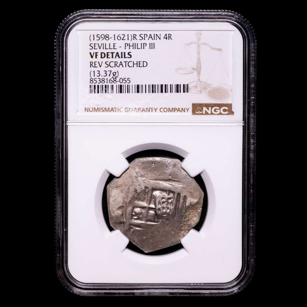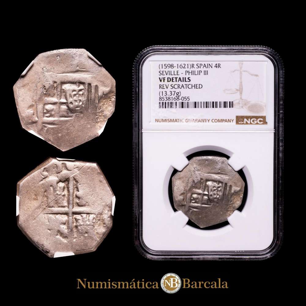 Numismática Barcala > Productos > Felipe III, 1598-1621. Cob 4 Reales, (1598-1621) R, Ceca de Sevilla, 13,37 g . (AC. tipo 154). Encapsulada por NGC como VF Detalles.