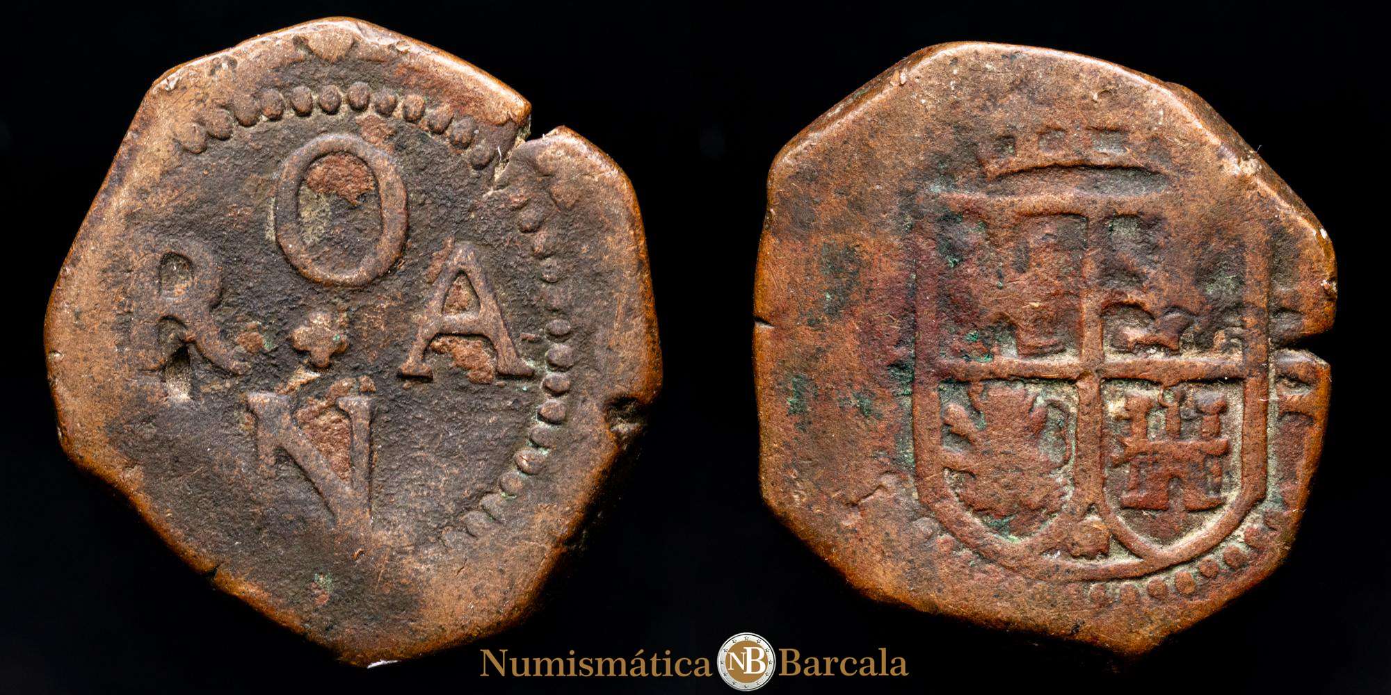 Numismática Barcala > Productos > Felipe III. (Toledo). 4 maravedís. (Cal. 282.Tipo 65 ). 8,92 gramos. (1618). Acuñada para el comercio de Orán. Escasa. MBC.