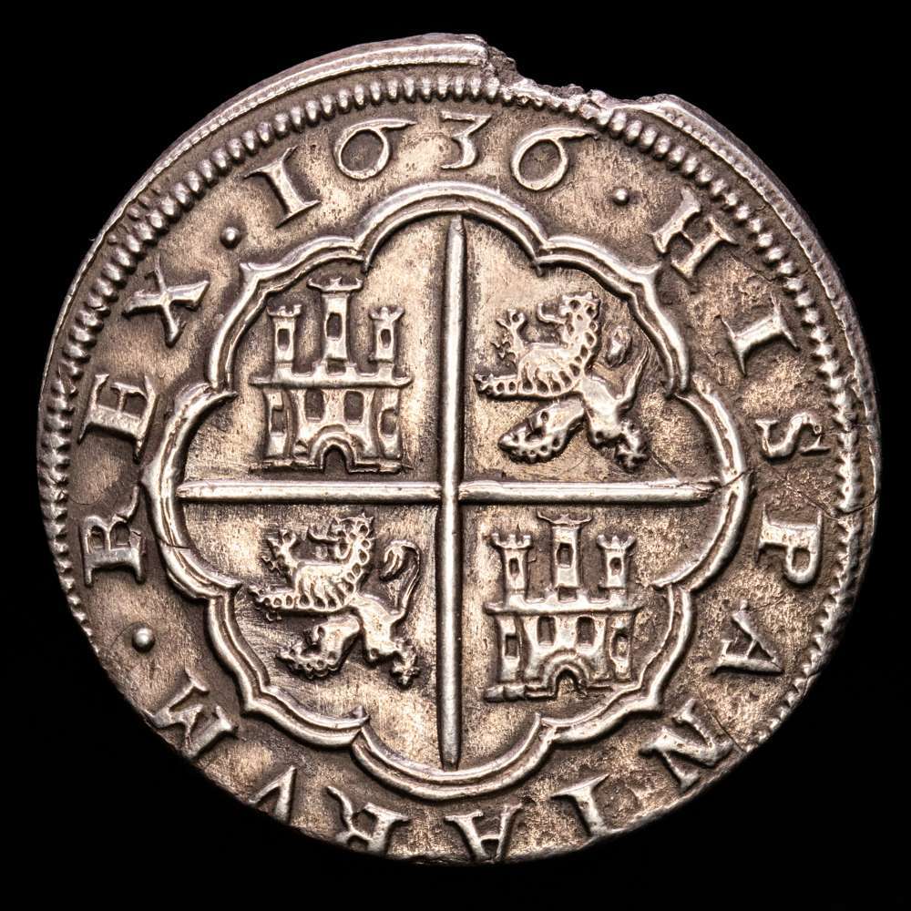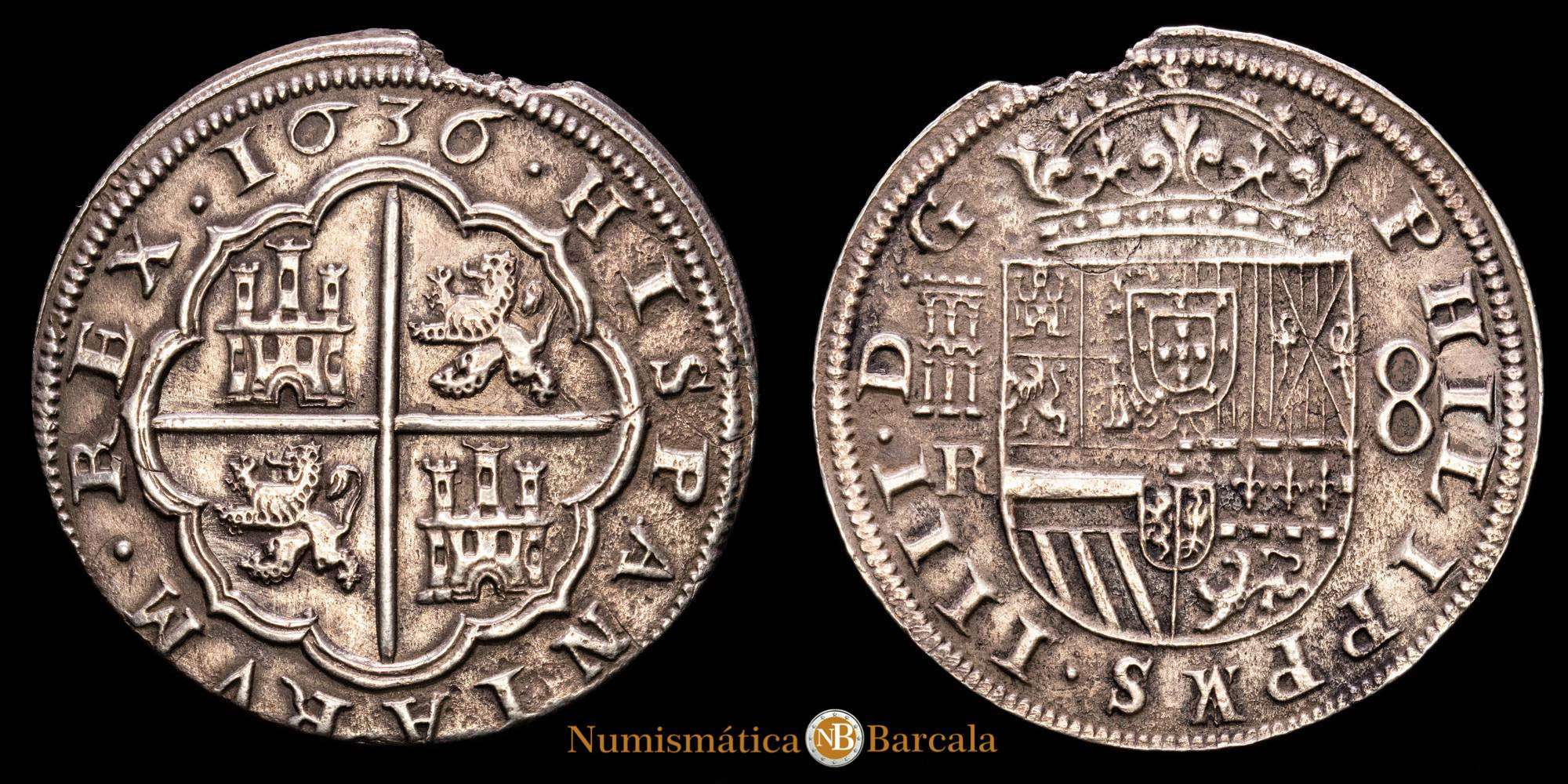 Numismática Barcala > Productos > FELIPE IV (1621-1665). 8 reales. 1636. Segovia R. (Cal-1611). Valor 8 a derecha, acueducto vertical y ensayador a izquierda. Variante: La V de PHILIPPVS rectificada sobre A. MBC+. Rara.