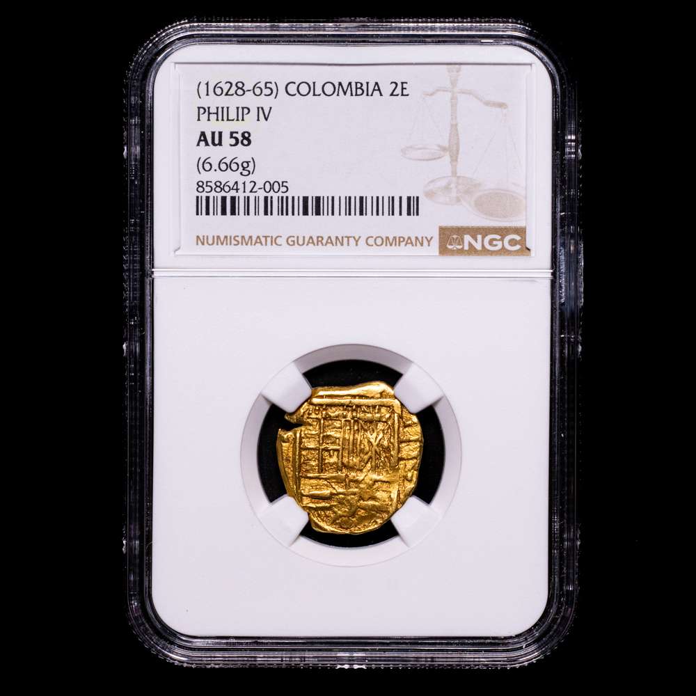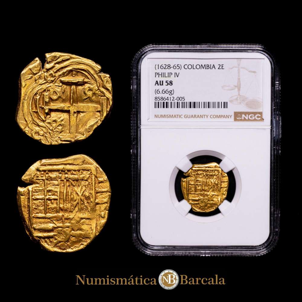 Numismática Barcala > Productos > Felipe IV (1628-1665). 2 escudos. ND (1642-1663). Santa Fe de Nuevo Reino. (Cal-Tipo 386). Au. 6,66 g. Fecha no visible, valor II horizontal. Rara. Encapsulada por NGC como AU 58.