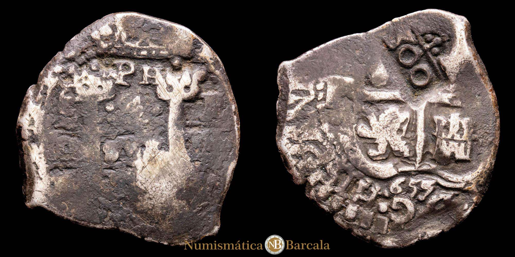 Felipe IV. 4 Reales. (12,78 g.). Potosí. 1655. GOMEZ 46.D1. VF. R-2 Resello de 300 Reis Alfonso VI de Portugal