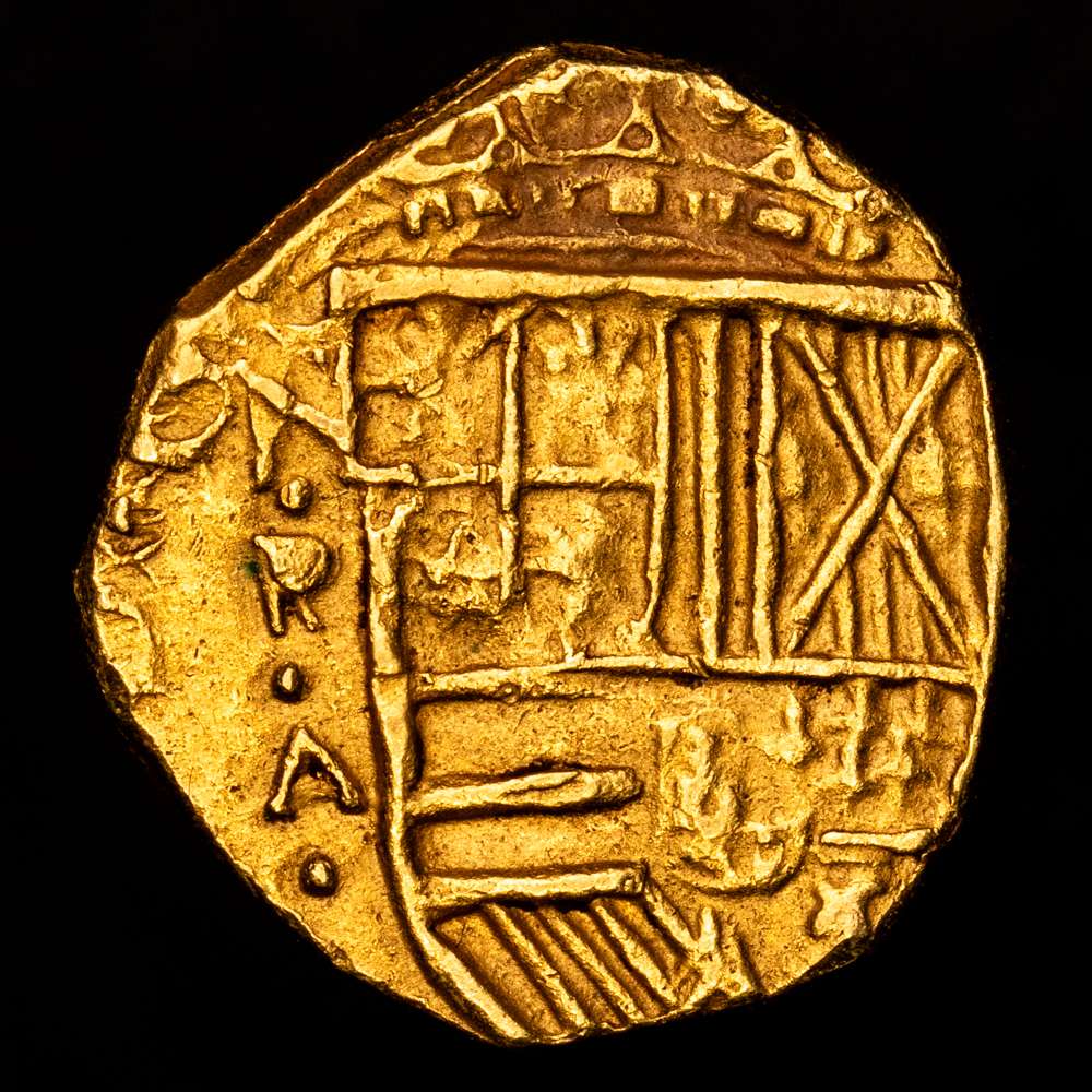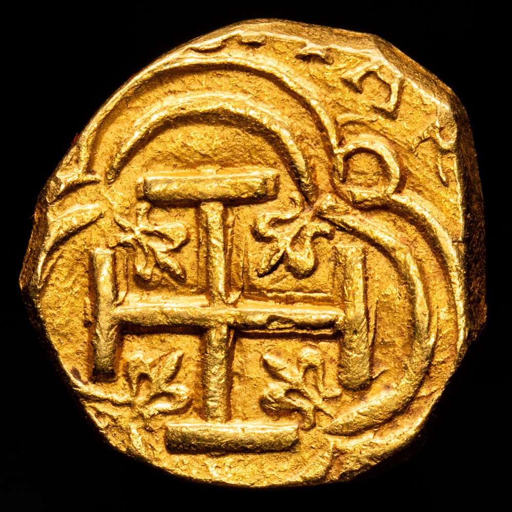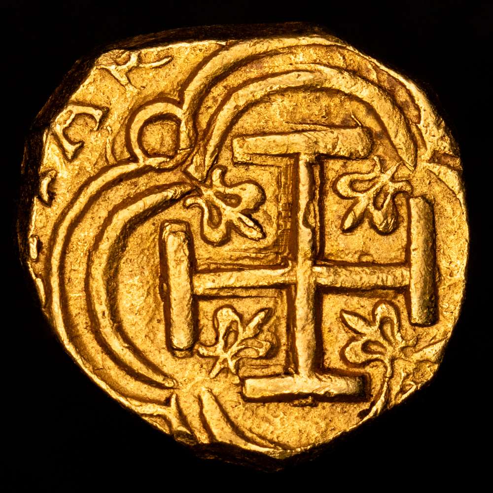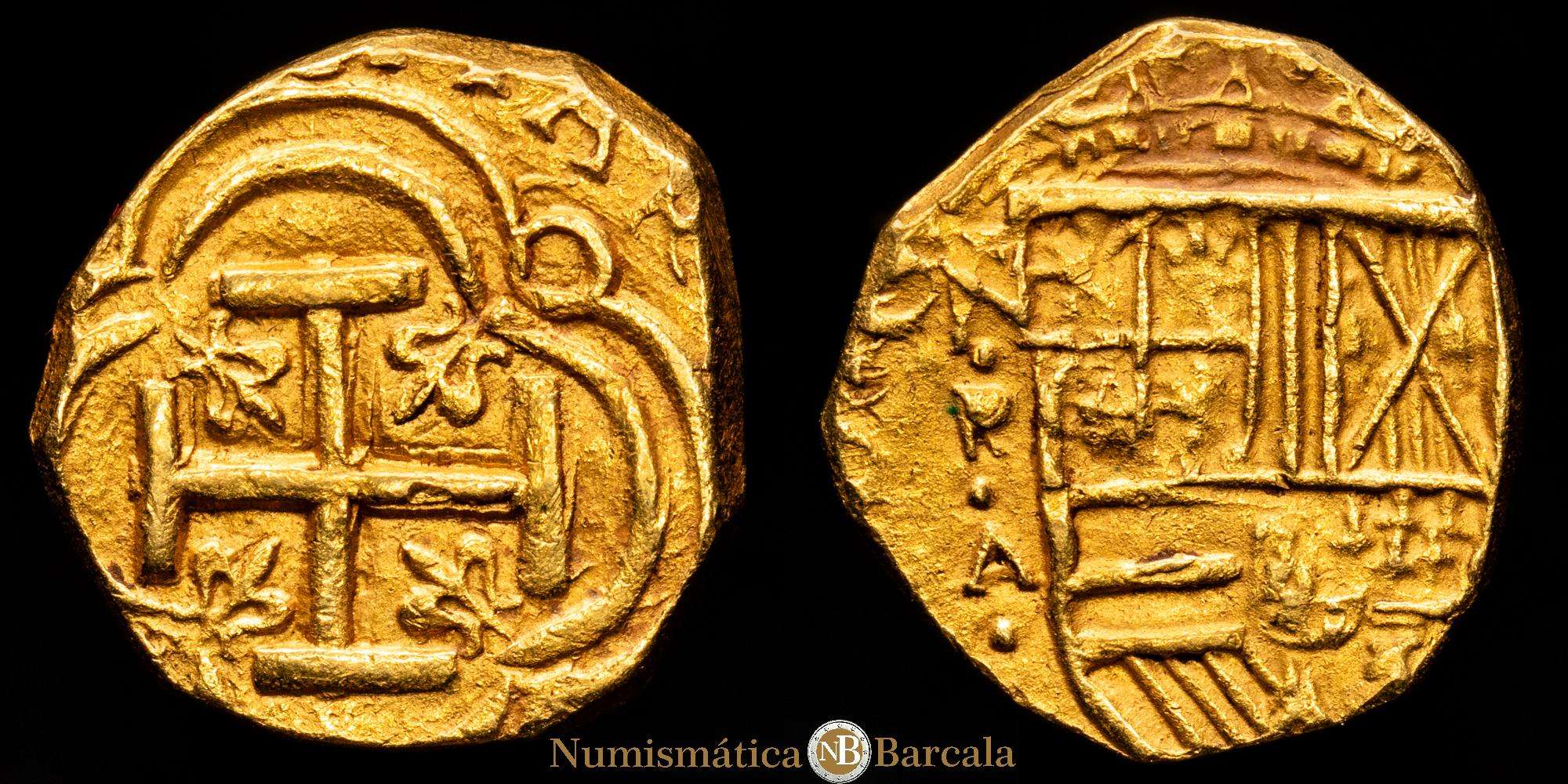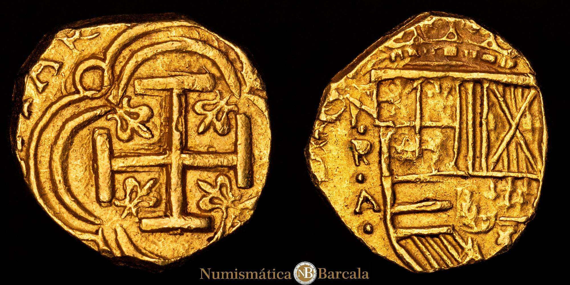 COLOMBIA. (AC-1791) Restrepo M50-13 – 2 Escudos (1635) Nuevo Reino NR A. 6,81gr. EBC. Anverso con marca de ceca NR y ensayador A visible a la izquierda del escudo, este cuño en particular (mismo que ilustra Restrepo) muestra la N pegada al borde del escudo y la R grabada del tal modo que se asemeja a una P. El reverso carece de puntos al interior de los anillos en el cuadrilóbulo, lo cual se identifica solo para ejemplares fechados 1635 ya diferencia de piezas 1636 si presentan puntos. Por lo demás, agradables detalles y prácticamente sin desgaste en puntos altos, pequeñas manchitas oscuras en algunos sectores del escudo, mismas presentes en otros ejemplares provenientes del Tesoro del Mesuno (ca.1636).