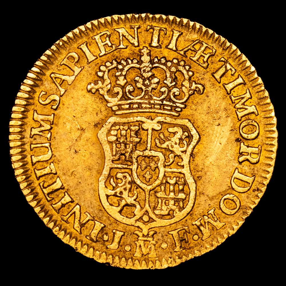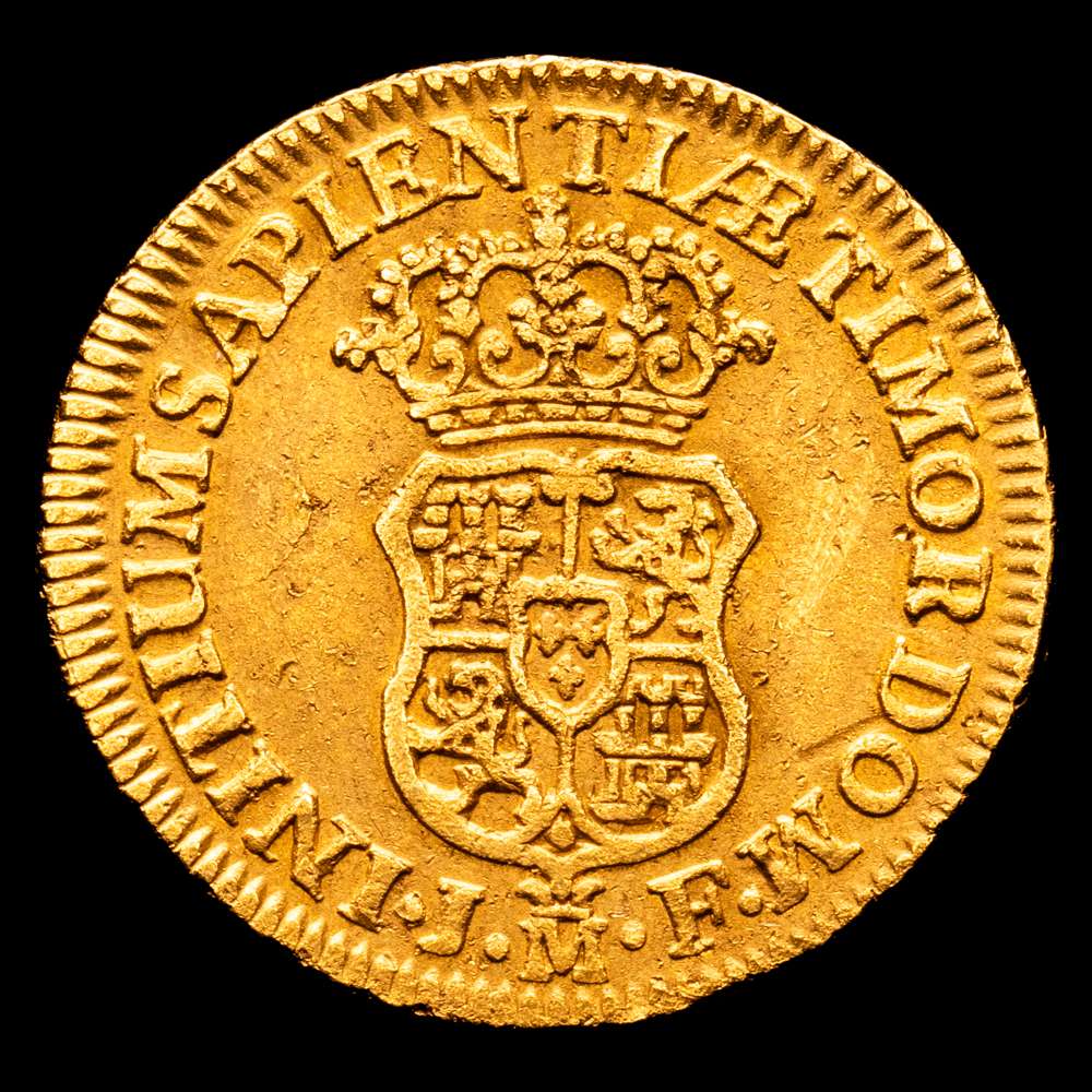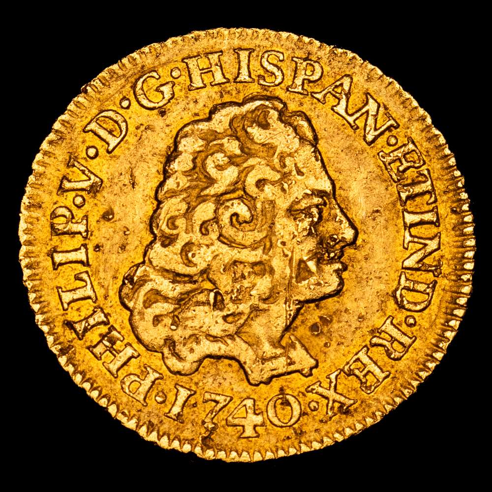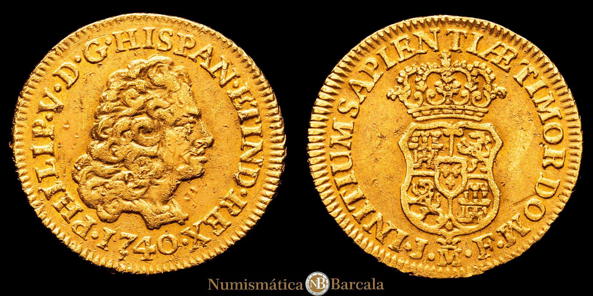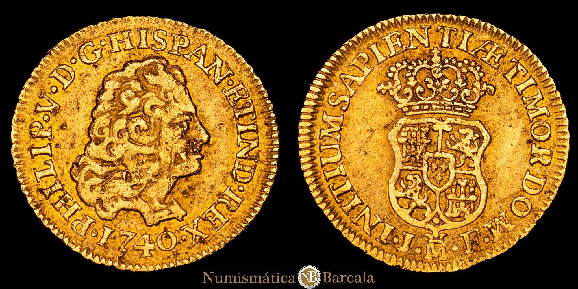 Felipe V (1700-1746). 1 escudo. 1740. Madrid. JF. (Cal-1719). Au. 3,34 gramos. Sin indicación de valor. Golpecitos Rara. VF.