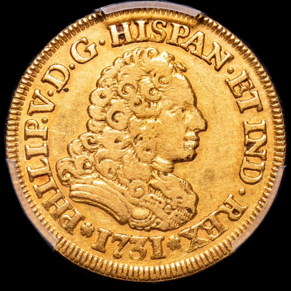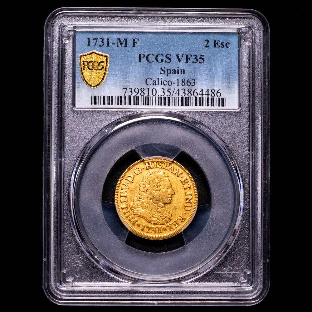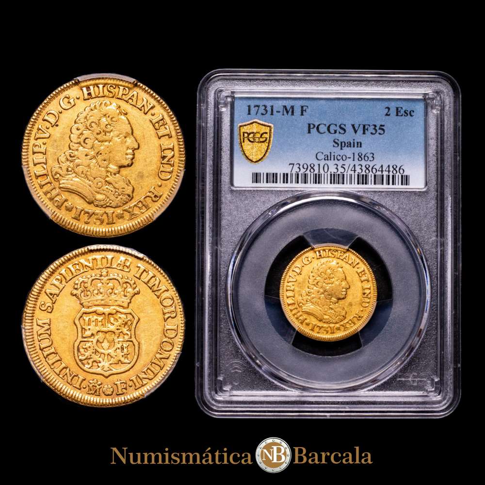 Numismática Barcala > Productos > Felipe V (1700-1746). 2 escudos. 1731. Madrid. F. (Cal-1863). KM-352. Sin indicación de valor. Rara. Encapsulada por PCGS como VF35.