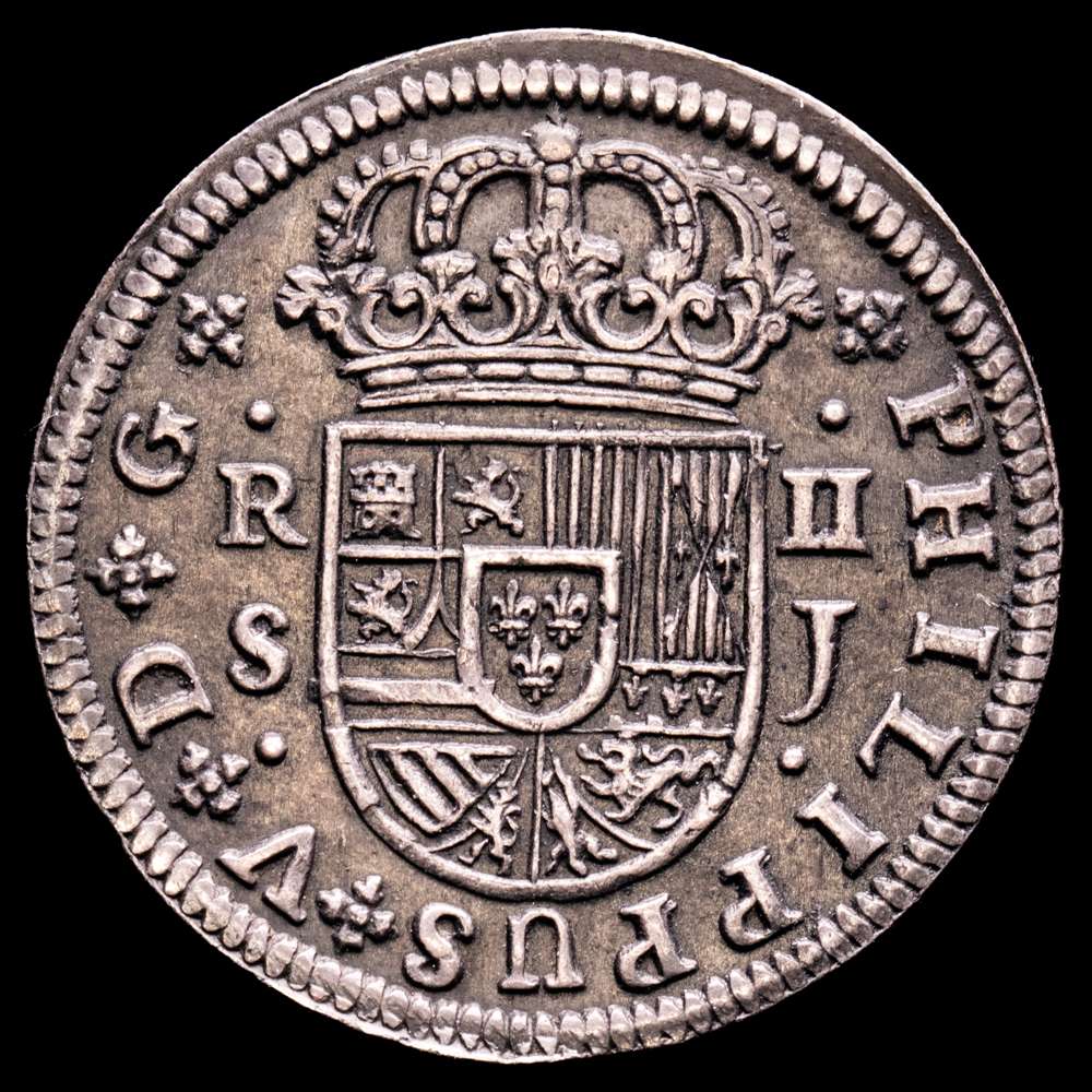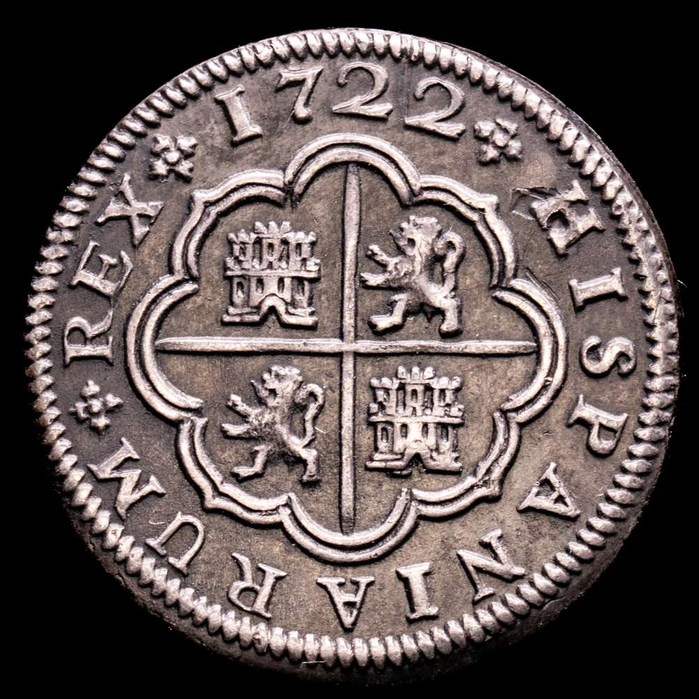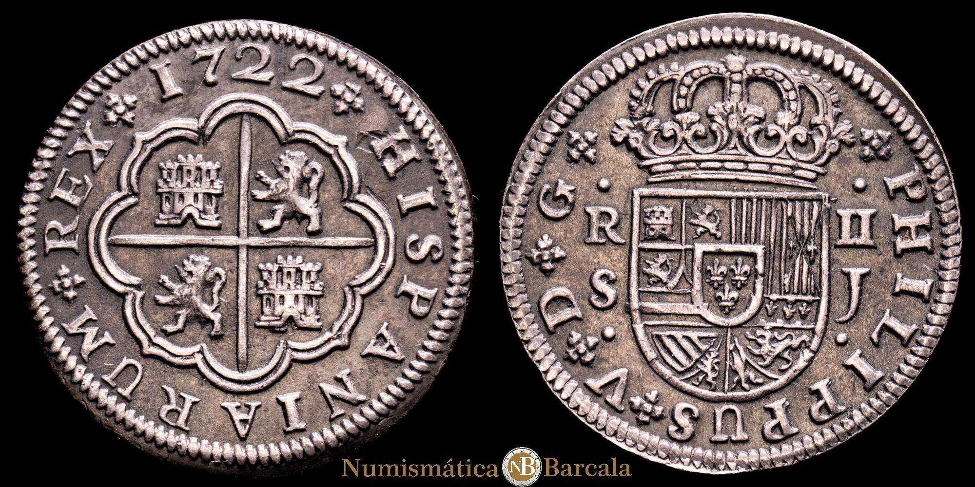 Numismática Barcala > Productos > Felipe V (1700-1746). 2 reales. 1722. Sevilla. J. (Cal-980). Ag. 6,13 g. Brillo original. Escasa en esta conservación. EBC. Pátina oscura.