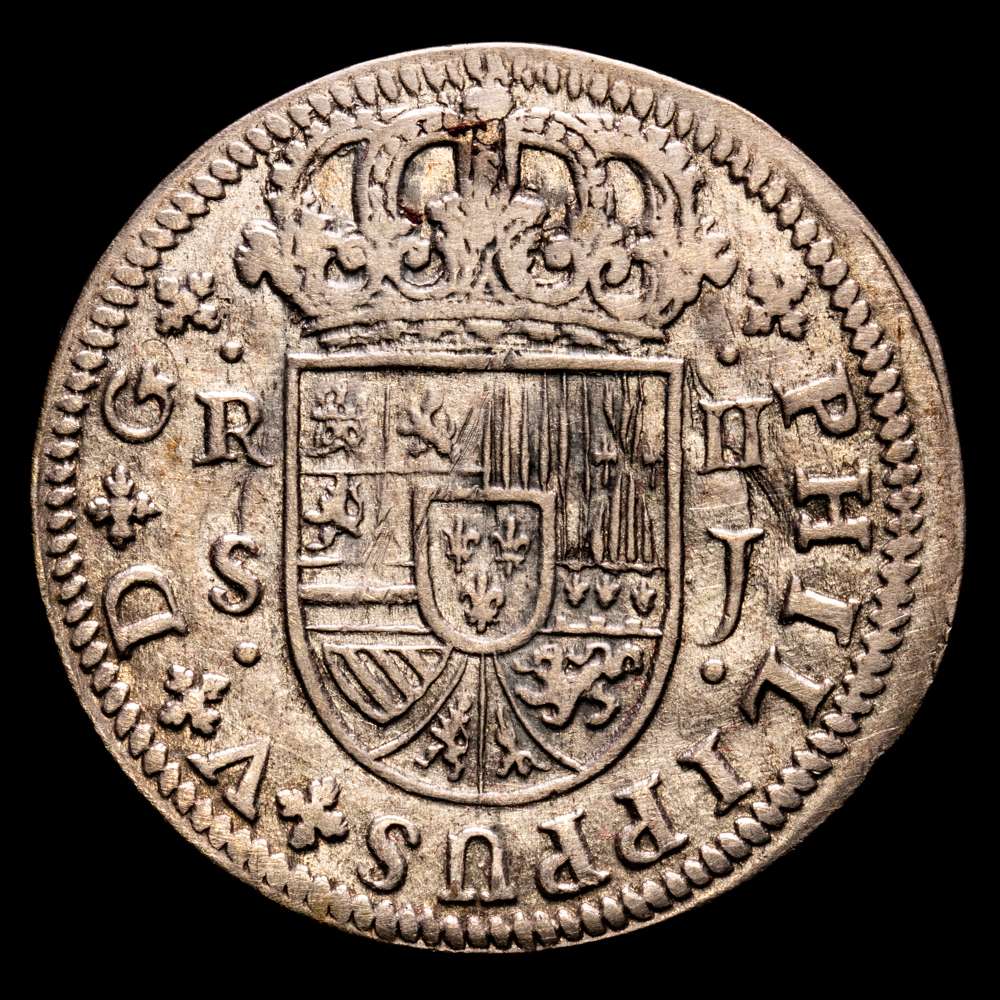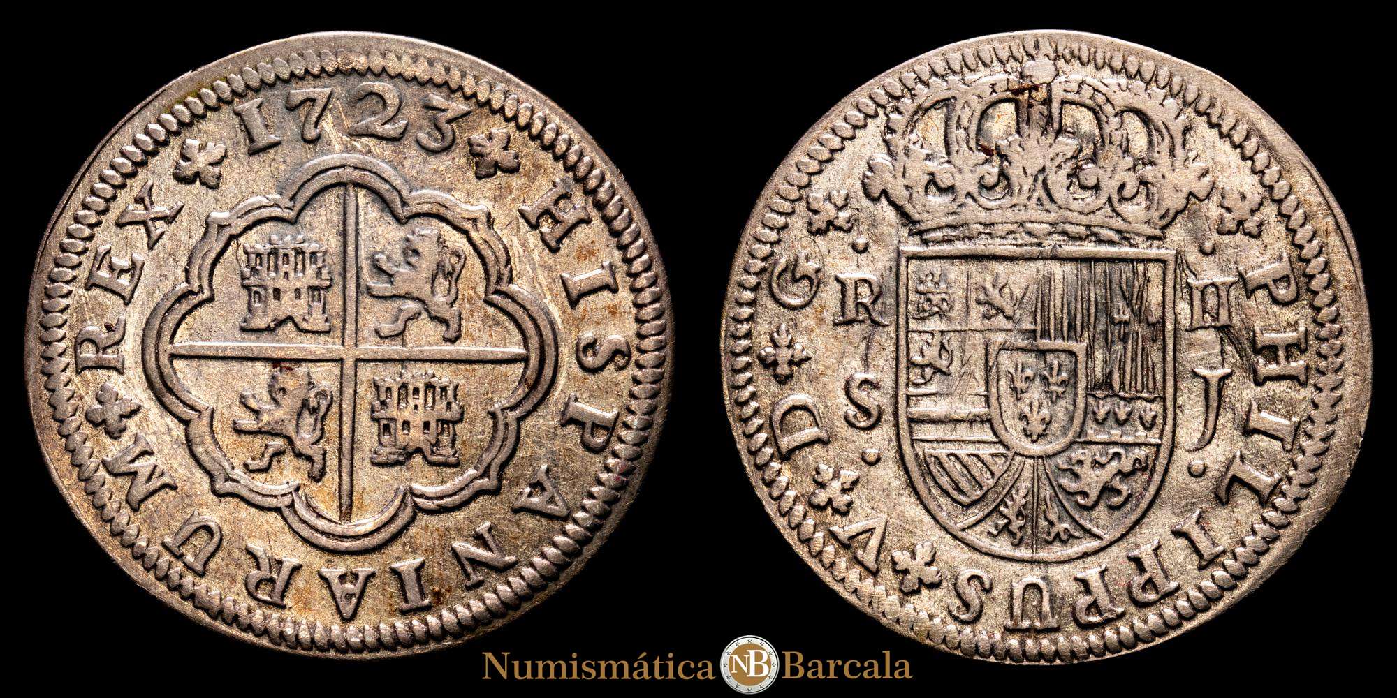 Numismática Barcala > Productos > Felipe V (1700-1746). 2 reales. 1723. Sevilla. J. (Cal 2019-981). Ag. 5,15 gramos. Ligero tono. MBC+.