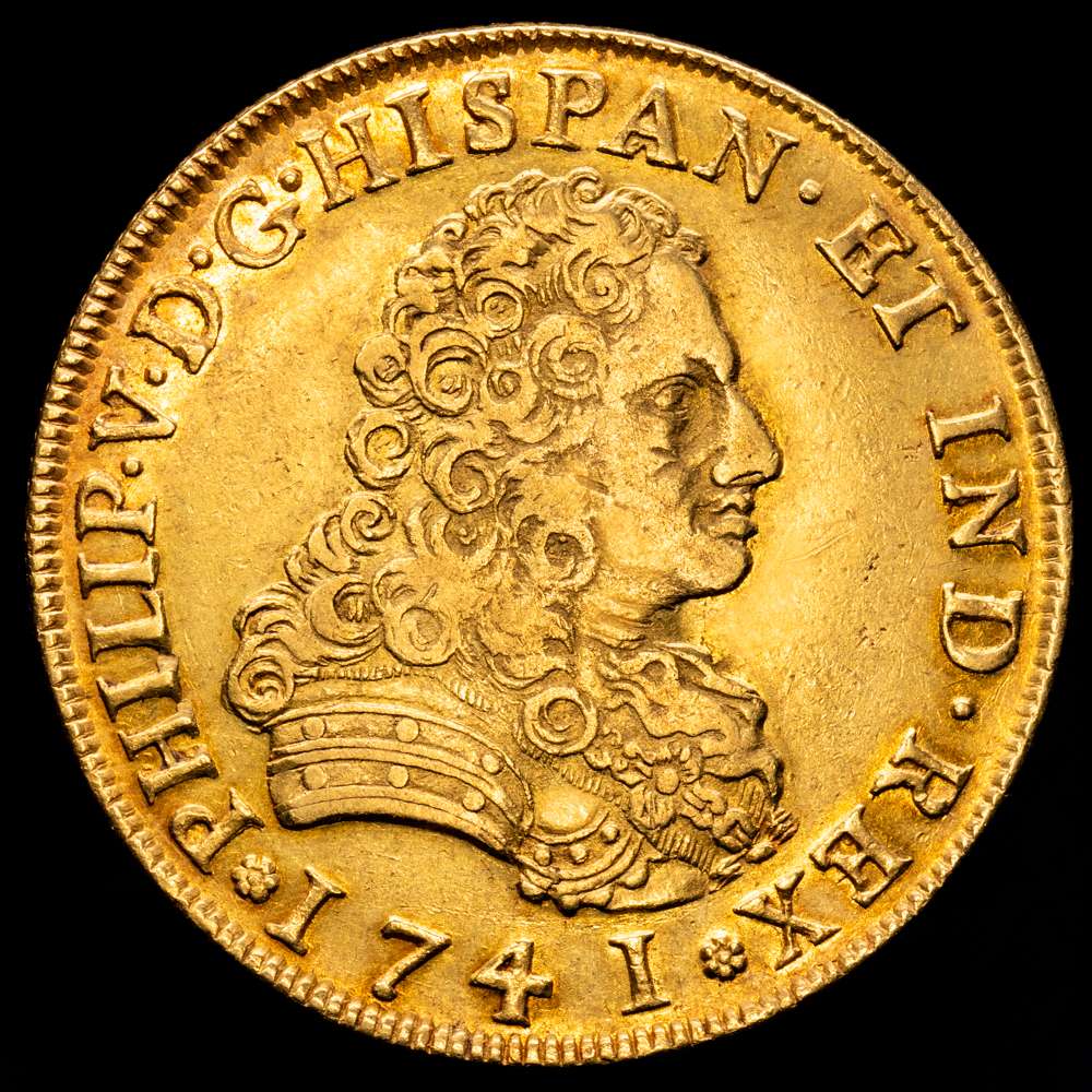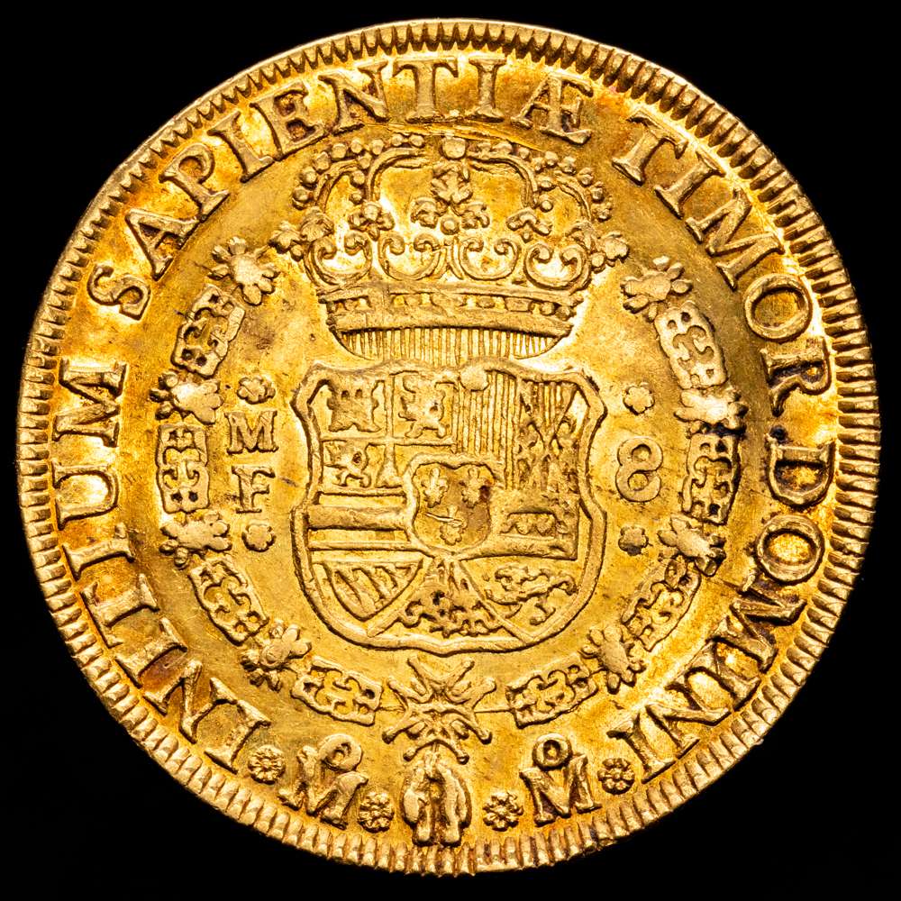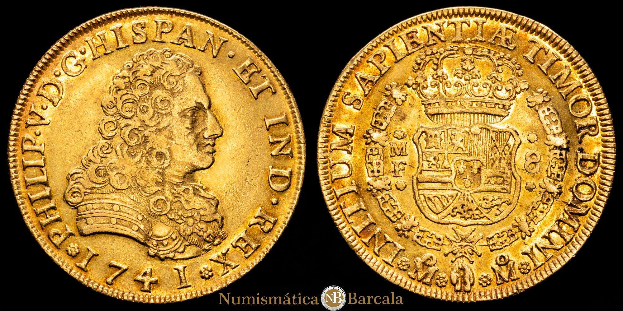 Felipe V (1700-1746). 8 escudos. 1741. México. MF. (Cal-135). (Cal onza-437). 27,01gr. Au. Parte de brillo original. Rara. XF. Bonito color.