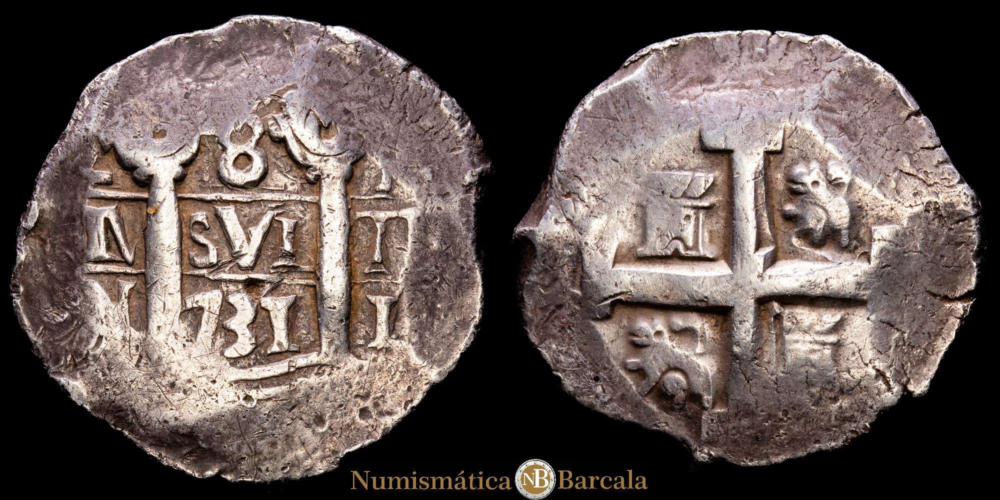 Numismática Barcala > Productos > Felipe V (1700-1746). 8 reales. 1731. Lima. N. (Cal-1305). Ag. 27,38 g. Doble ensayador. Escasa. VF.