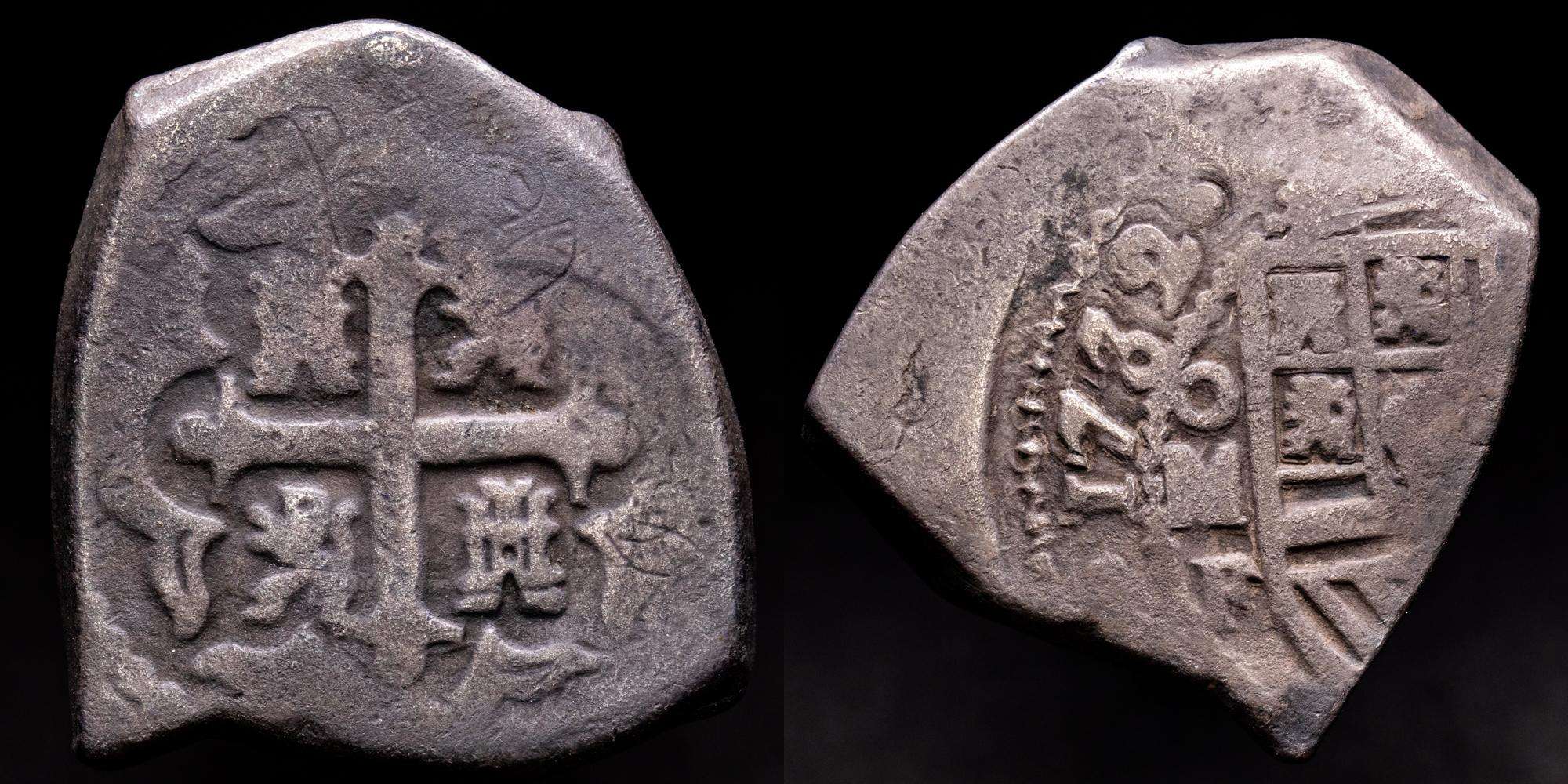 Felipe V (1700-1746). 8 reales. 1732. México. F. (Cal-1427). Ag. 25,66 gramos. Cospel grueso con la cruz completa y fecha de cuatro dígitos muy marcada, Marca de ceca y ensador perfectamente visibles. Pátina. Leves graffitis en el reverso. Rara. Ex colección Rob Woodside. MBC.