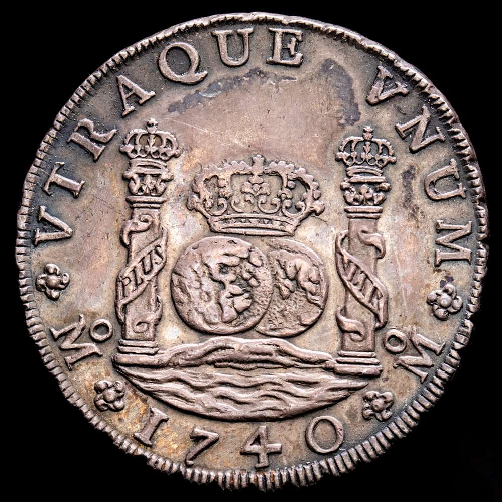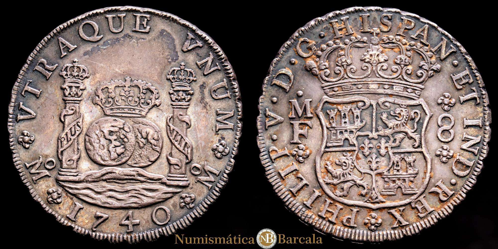 Numismática Barcala > Productos > Felipe V (1700-1746). 8 reales. 1740. México. MF. (Cal-1456). Ag. 27,04 gramos. Pátina oscura con ligeros tonos iridiscentes. Atractivo ejemplar. EBC/EBC+.