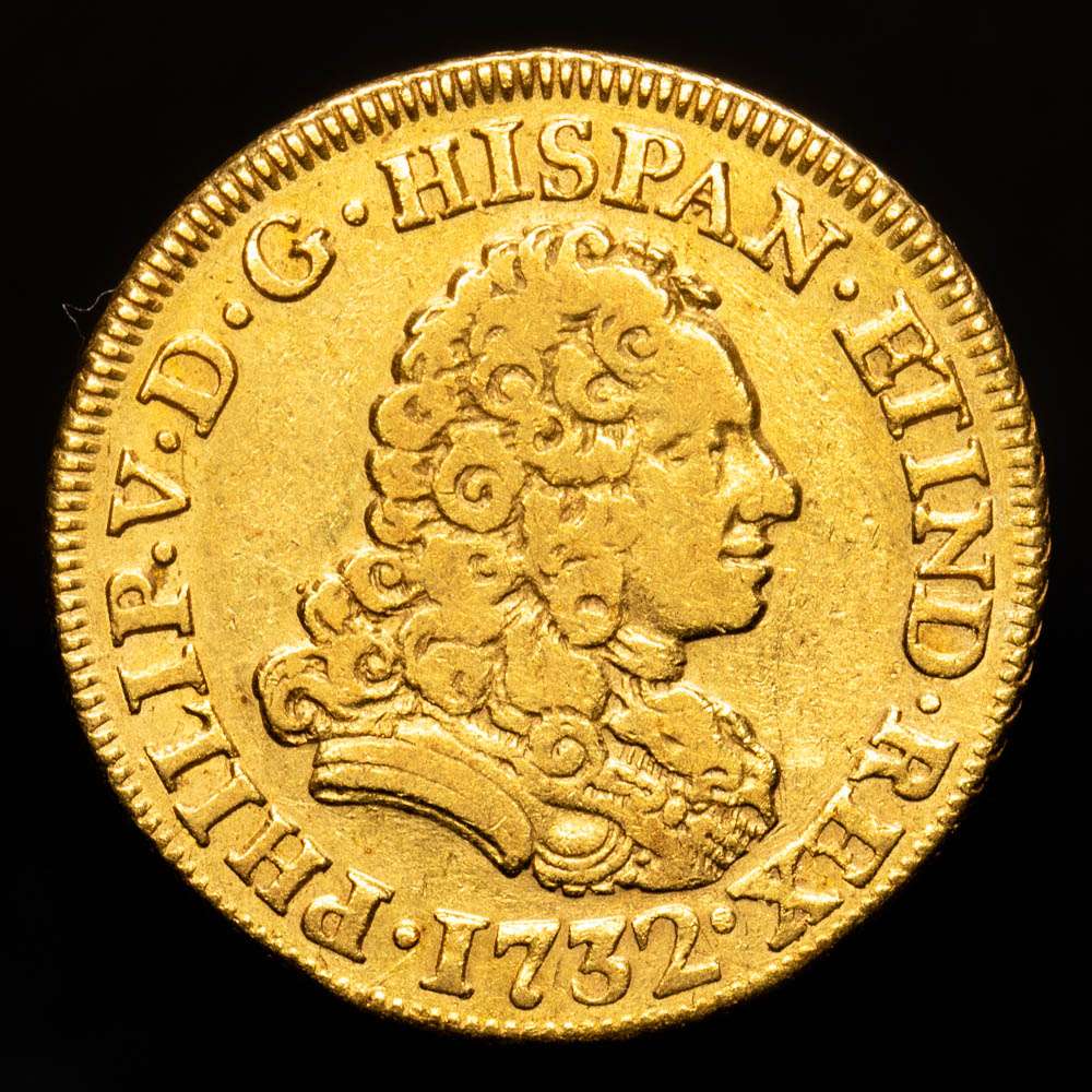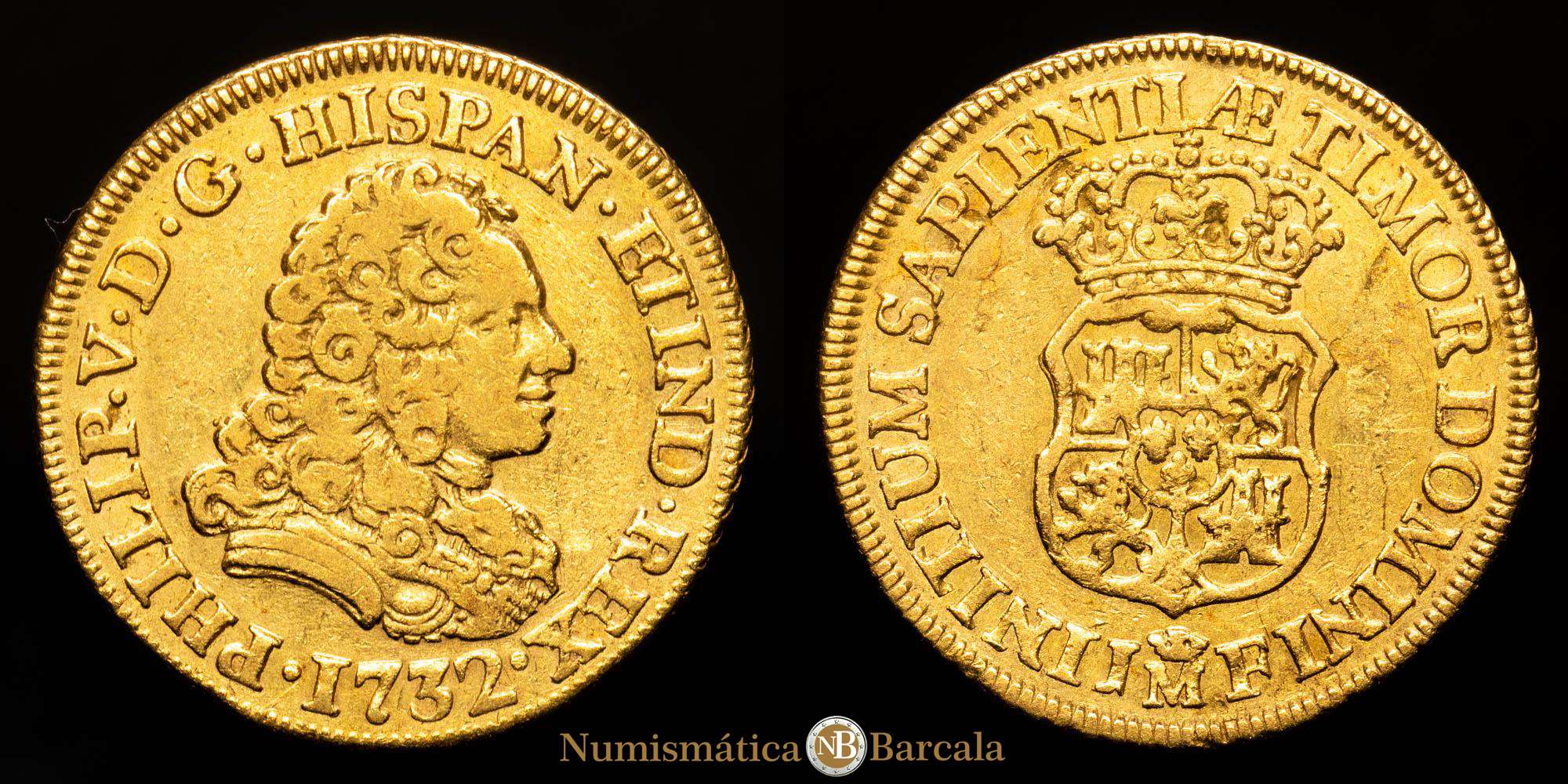 Numismática Barcala > Productos > Felipe V. 2 Escudos. (6,67 g.). Madrid. 1732. J·F. AC-1869. MBC. Leyenda del reverso sin puntos. Cy9722vte. MBC+. Muy rara.