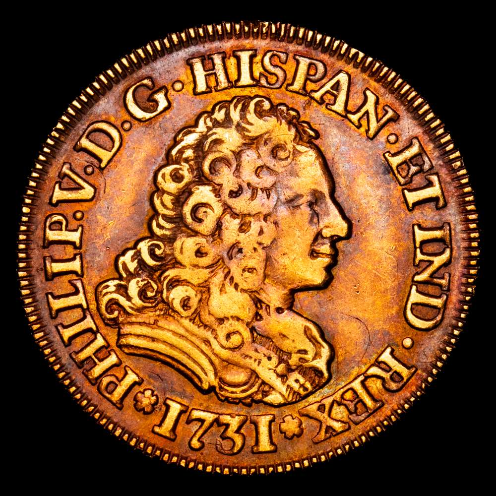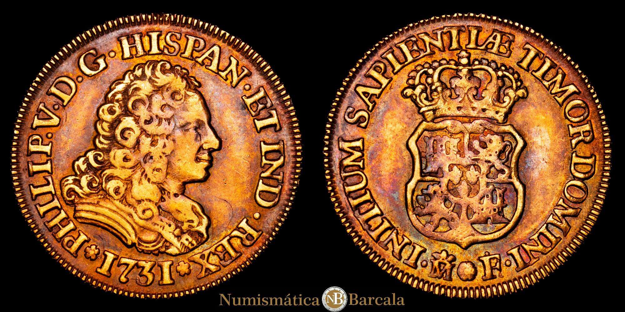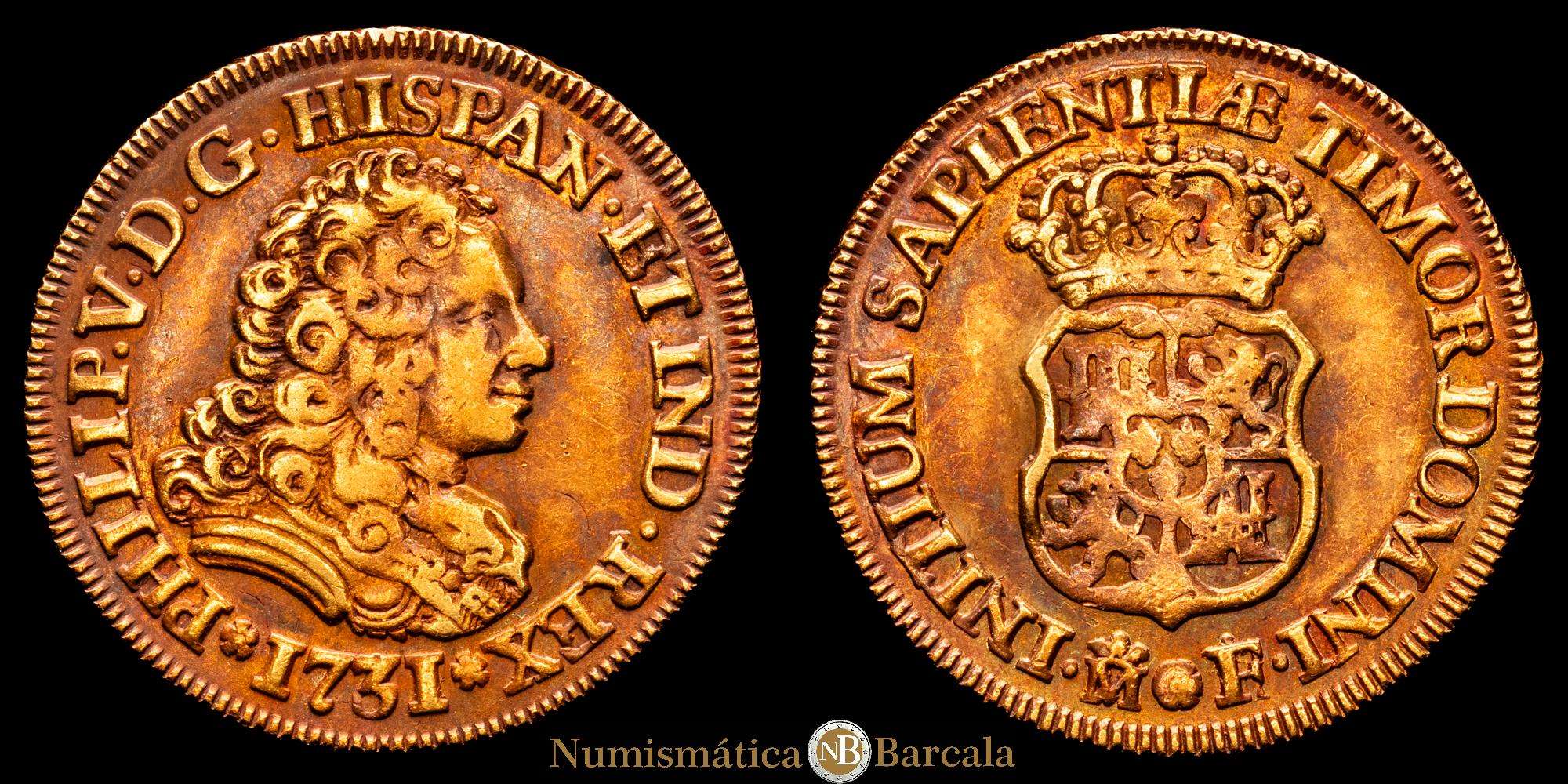 Felipe V. 2 Escudos. (6,73 g.). Madrid. 1731. F. (AC. 1863). Pátina. Raro. 6,73 gramos. VF.