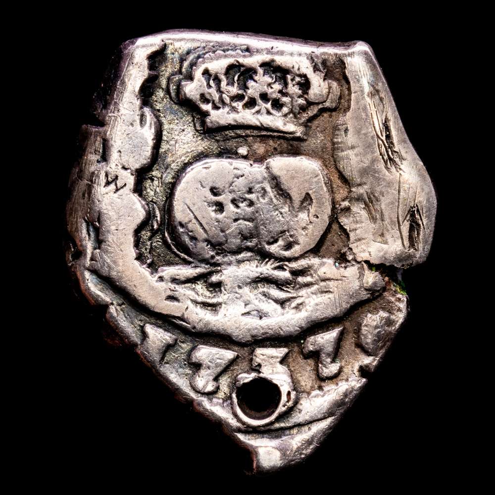 Gibraltar – Felipe V. 1/2 Bit. (1,33 g.). México. 1746. Ensayador M. VG 20. Rara. T-1 Heart cut on 1/2 Real