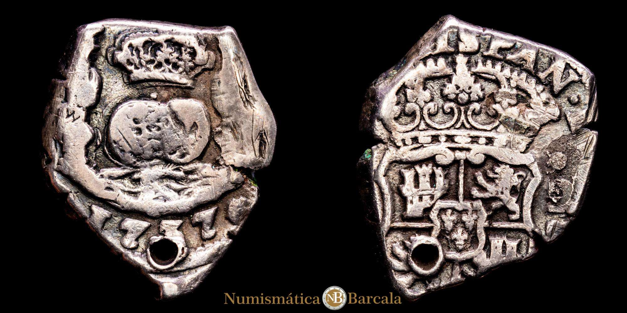 Numismática Barcala > Productos > Felipe V. 2 Reales. (6,57 g.). Guatemala. 1737. Ensayador J. Aureo y Calico-681. MBC+. Escasa