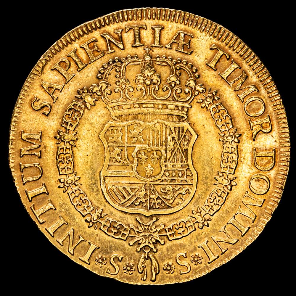 Numismática Barcala > Productos > Felipe V. 8 Escudos. (27,12 g.). Sevilla. 1729. S. AC-2303. EBC. Restos de brillo original. Bello color. Muy Rara.