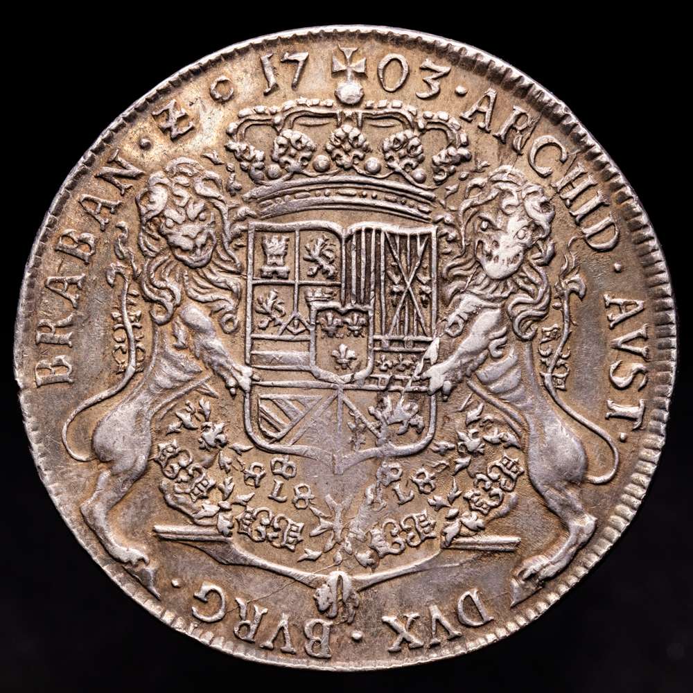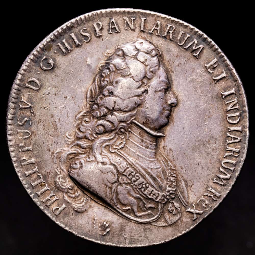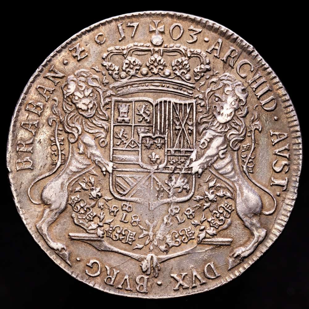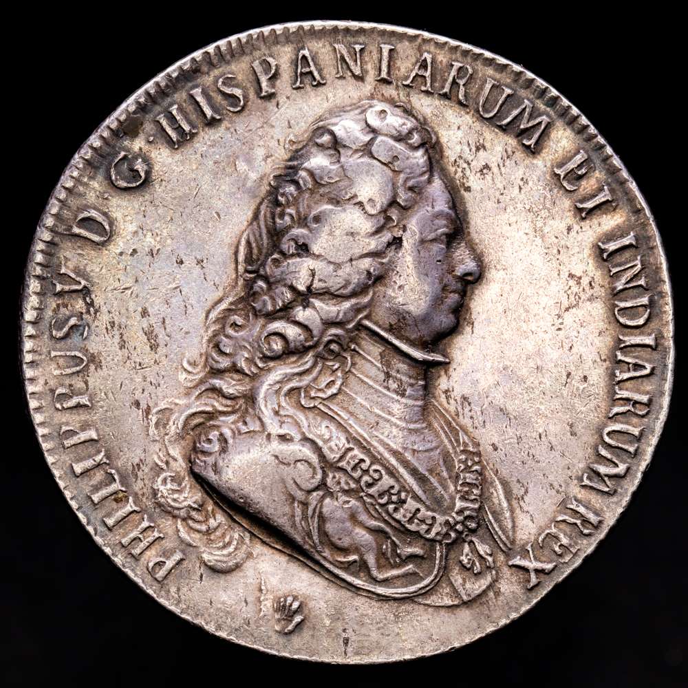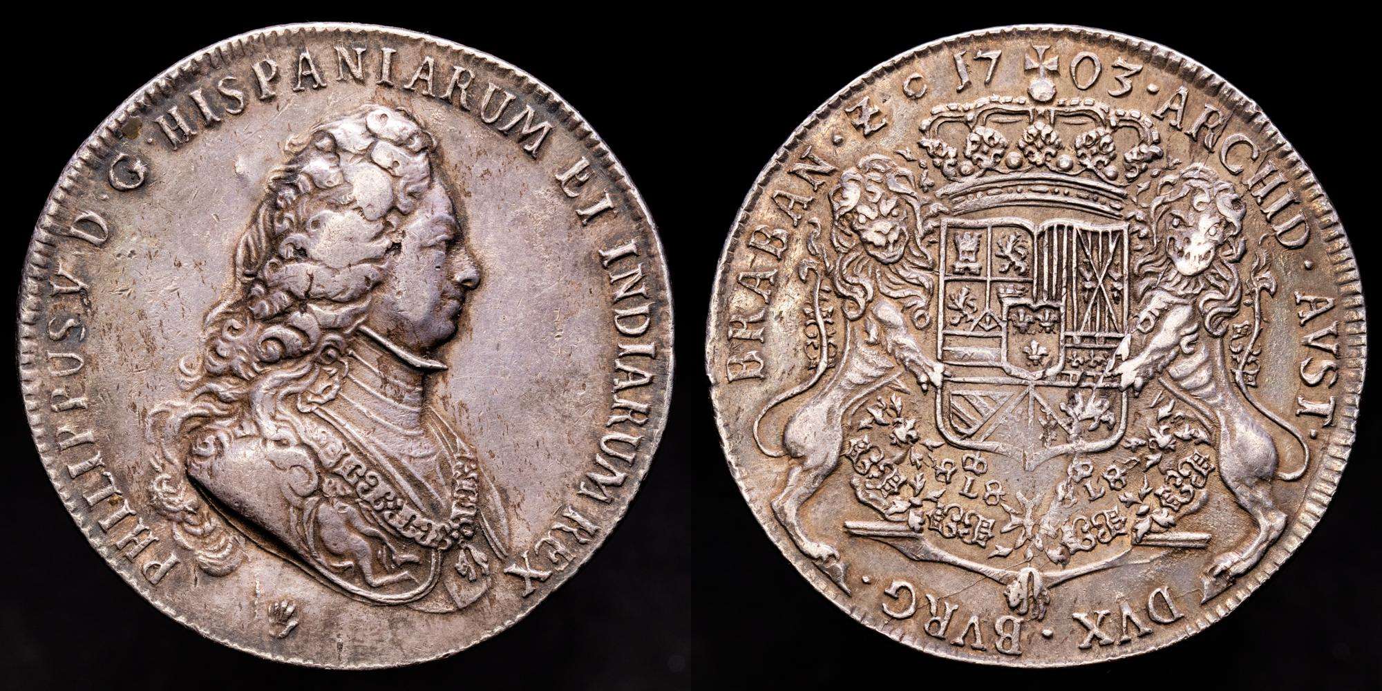 FELIPE V. Ducatón. 1703. AMBERES. BRABANTE. 32,56 grs. AR. Segundo tipo. (Cuño roto en el reverso). Bonita pátina. RARA. Vanhoudt-736AN; Vti-85. MBC+/EBC-.